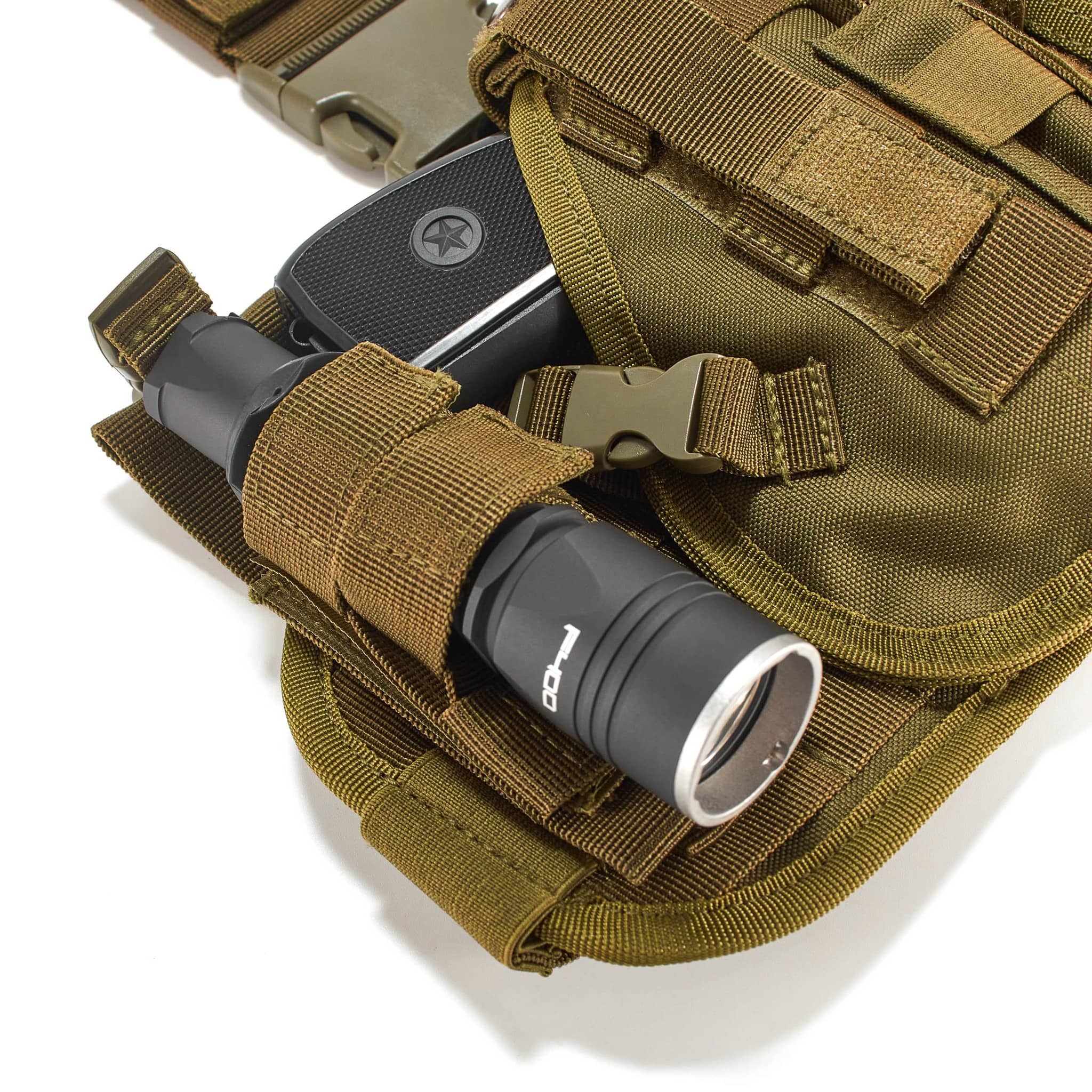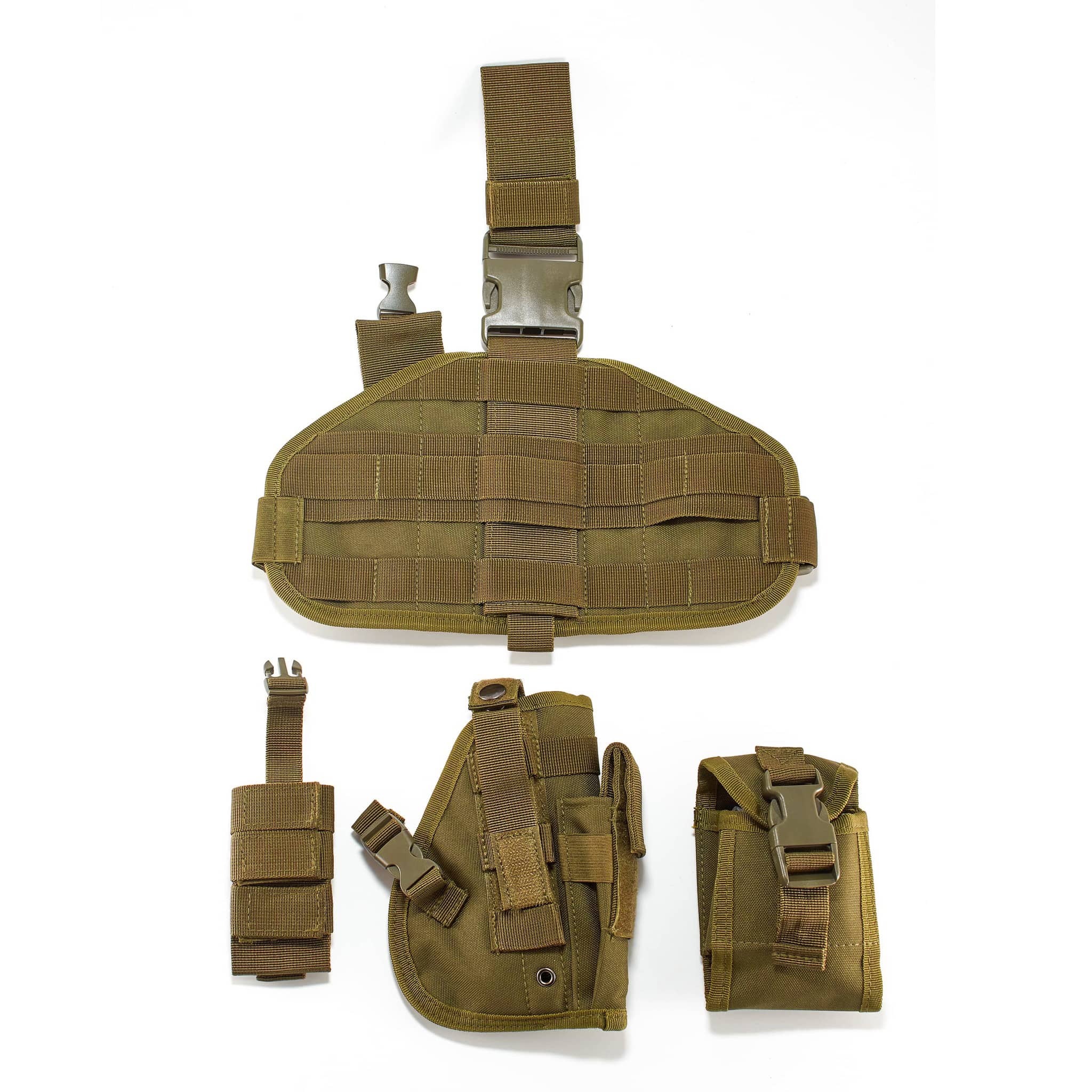 Кобура 3 в 1 набедренная универсальная оливковая. Изготовлена из качественного нейлона. Отличается своей функциональностью и прочностью. Кобура удобная и простая в эксплуатации. Имеет регулируемые ремни для крепления к бедрам и поясному ремню.