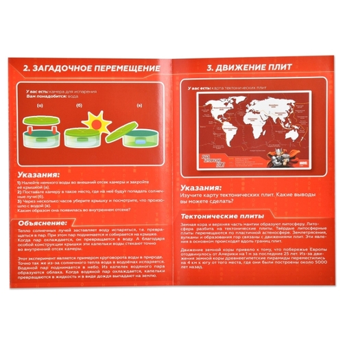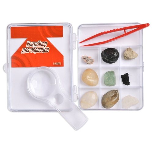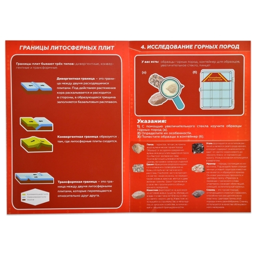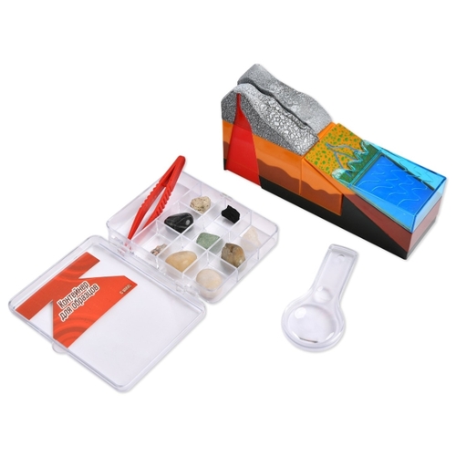 Комплектация- образцы горных пород;- камера для испарения;- лупа;- пинцет;- пипетка;- контейнер для образцов;- модель фрагмента поверхности Земли;- глина;- карта тектонических плит;- нструкция.