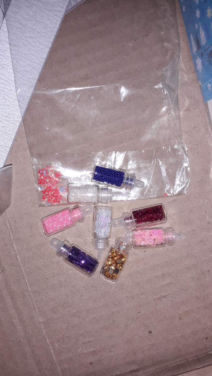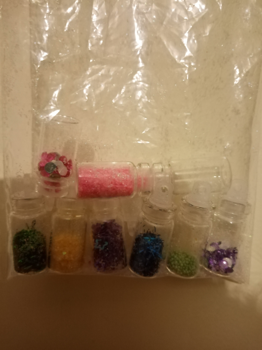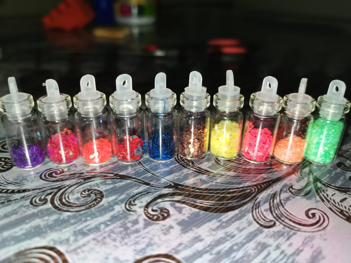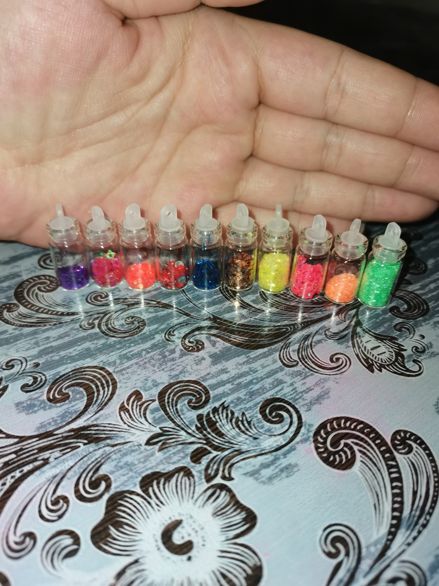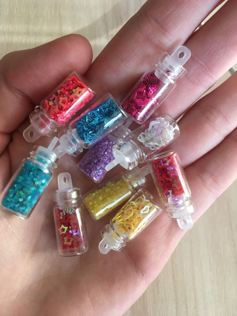 В наборе: 10 стеклянных бутылочек с блестками разных цветов. Высота одной баночки - 2 см. Размер блесток - приблизительно 0,5 мм. Возможно неравномерное заполнение баночек декором.Декоративные блестки разных цветов открывают массу возможностей для создани