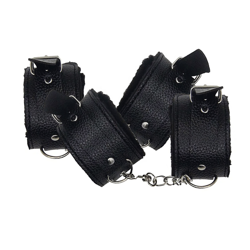 Состав комплекта:1. Фиксаторы для рук 2. Фиксаторы для ног 3. Крестообразный фиксатор 4. Зажимы на соски с болтиком для регулировки сдавливания, украшенные бубенцами 5. Дышащий кляп 6. Широкий ошейник 7. Поводок 8. Веревка 5 м. 9. Маска 10. Пуховка-щекота