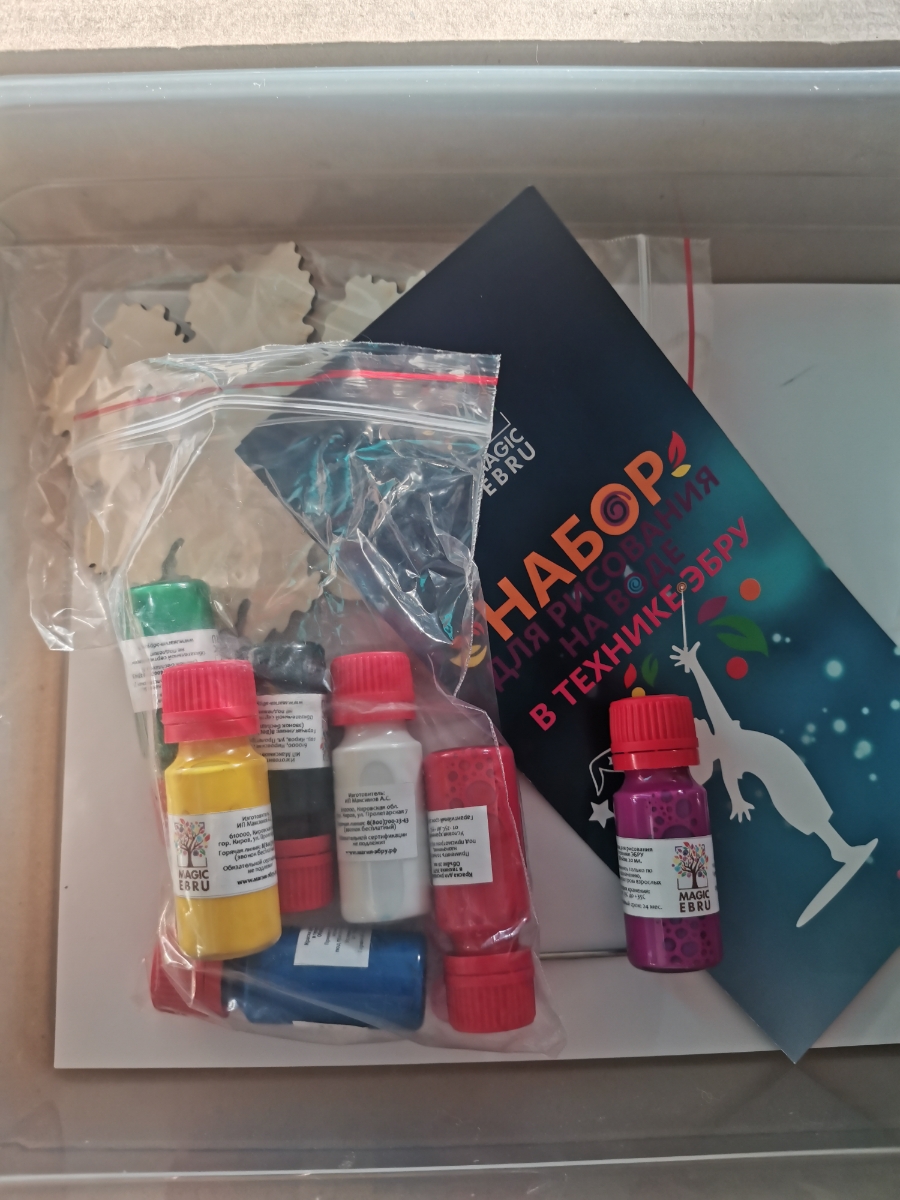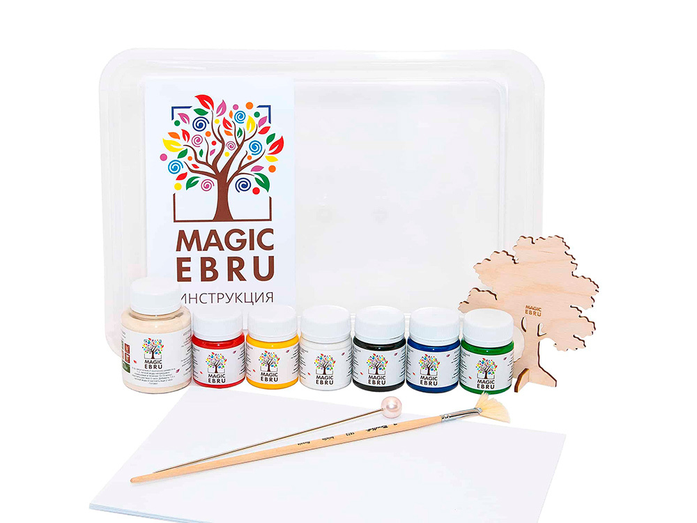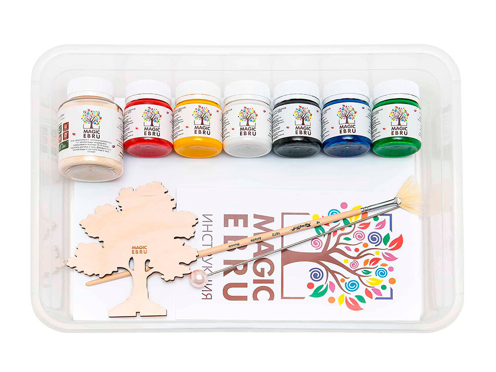 Комплектация:6 красок в баночках по 40 мл: белый, красный, желтый, синий, зеленый, черныйОписание:Наборы для эбру помогут научиться создавать произведения искусства с помощью воды и красок. Техника Эбру - искусство рисования на воде, сочетает в себе живоп