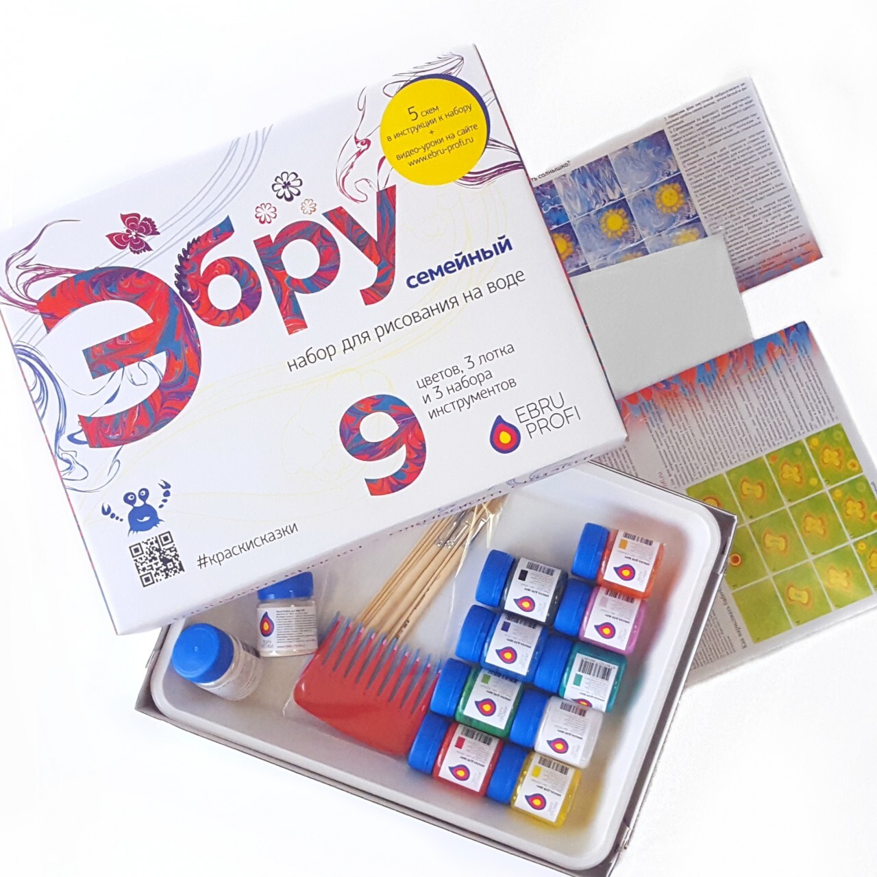 Комплектация:Набор для рисования на воде включает: 3 лотка для воды размера А4, бумагу для рисунков(30 листов) и очистки воды (45 листов), 9 баночек по 30 мл с эбру-краской (красная, оранжевая, желтая, синяя, изумрудная, зеленая, фиолетовая или сливовая,