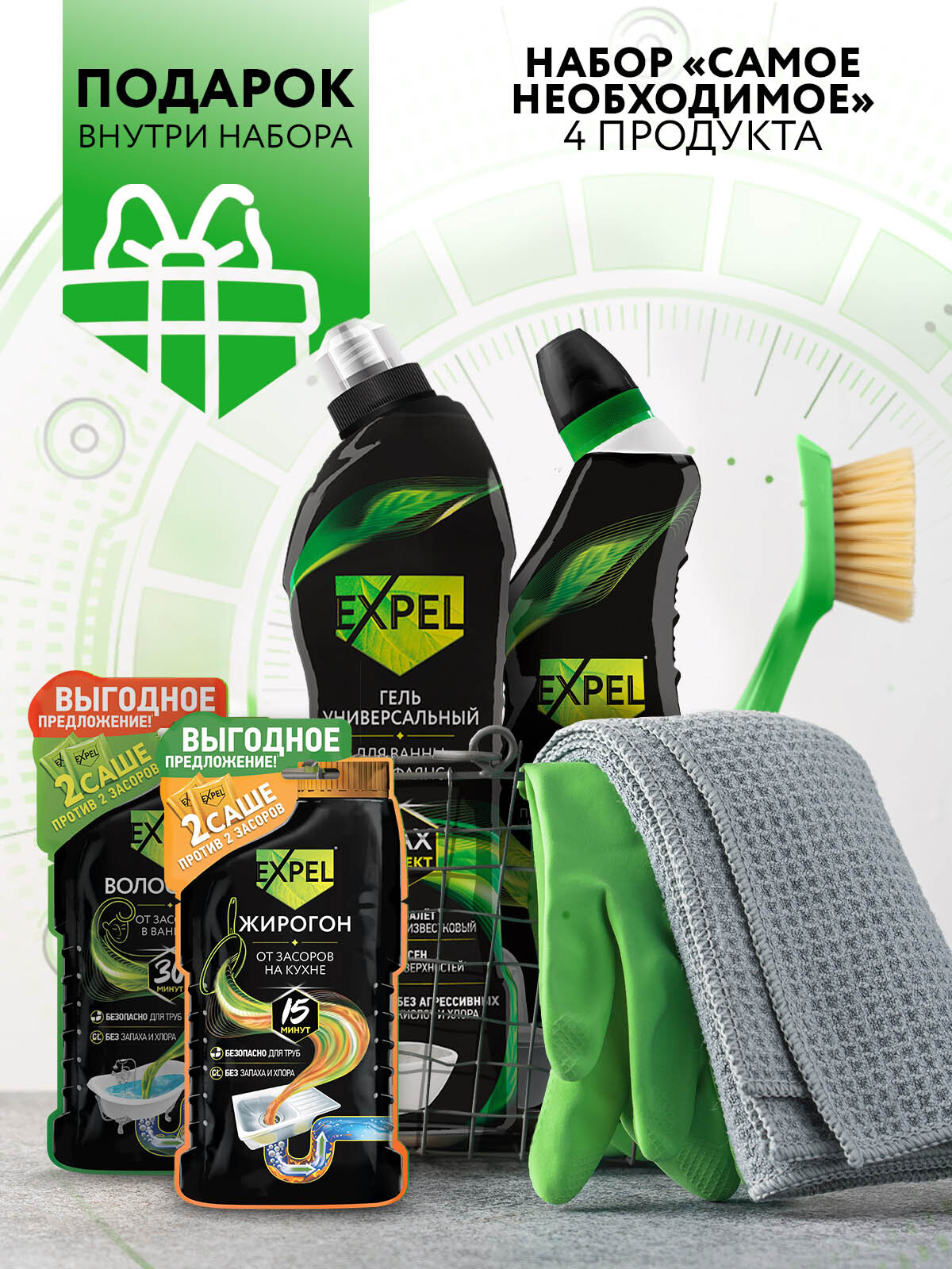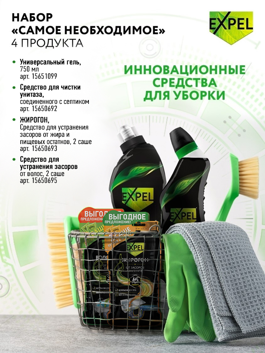 Состав:чистящие компонентыОписание:Expel представляет удобный набор для уборки "Самое необходимое", который поможет сделать ваш дом чистым и уютным.Набор включает инновационные средства, обеспечивающие пролонгированный эффект чистоты.С комплектом таких ср