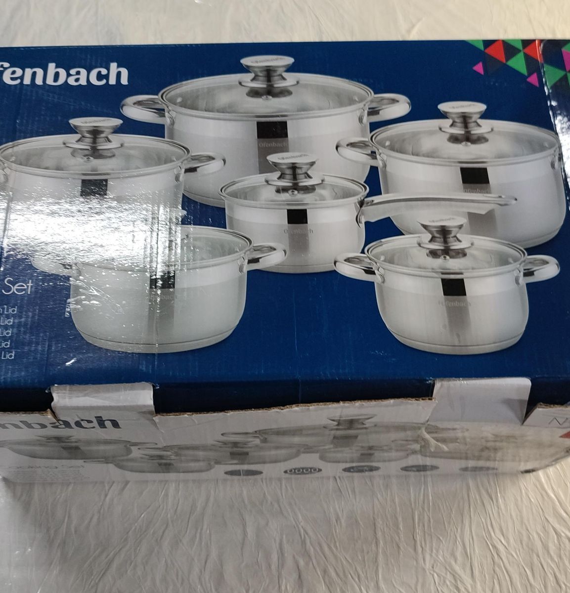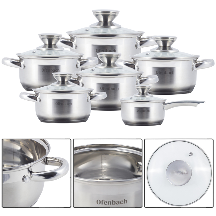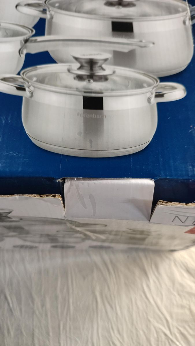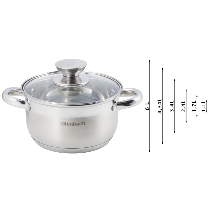 Тип: Набор посуды 12 элементов. (кастрюли 1,7л, 2,4л, 3,4л, 4,34л, 5,5л,, ковш 1,1л.) Материал: нержавеющая сталь. Индукционное дно. Термостойкая стеклянная крышка. Подходит для посудомоечной машины. Рекомендация: мыть перед использованием. Не использоват
