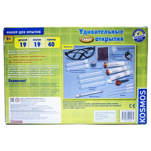 Комплектацияемкости с химическими веществами (3 шт.), инструмент для открывания крышек, двойная мерная ложка, пробирки (3 шт.), пипетки (3 шт.), резиновая пробка, защитные очки, батарейный зажим, пластиковые пробирки с винтовыми крышками (2 шт.), железный гвоздь, кра