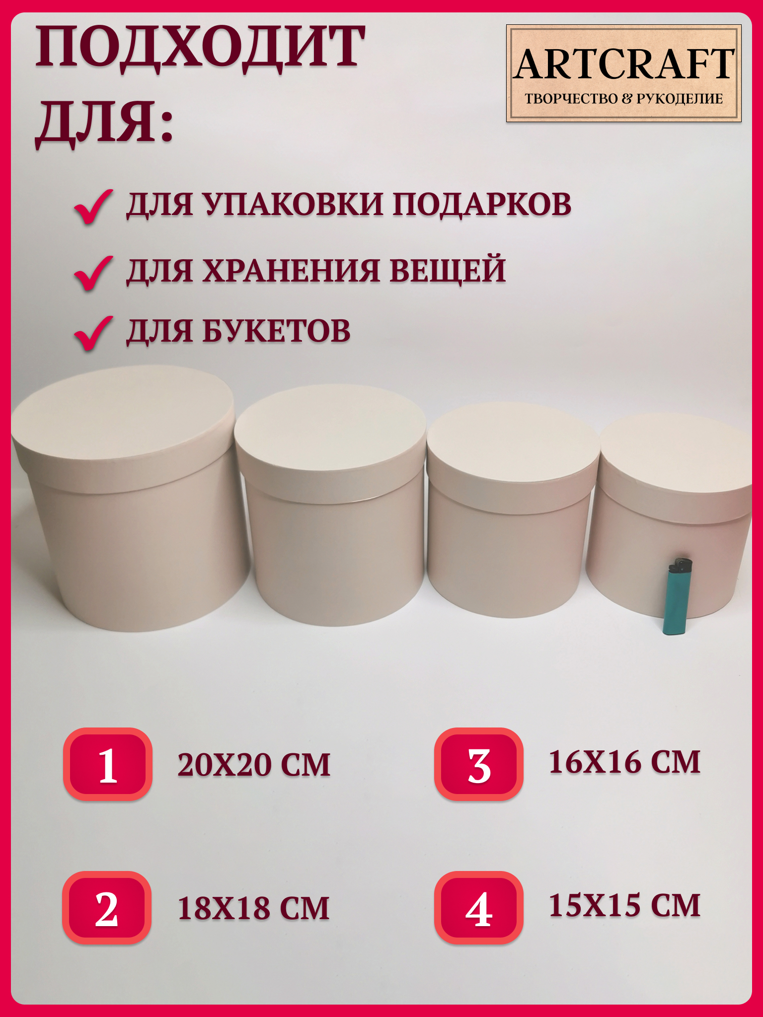 Набор коробок подарочных, круглых 4 в 1 - идеальный вариант, чтобы спрятать подарок или несколько подарков. Стильные, яркие и прочные коробочки уместны при упаковке подарка как близкому человеку, так и руководителю. Набор упаковочных коробок - цилиндров