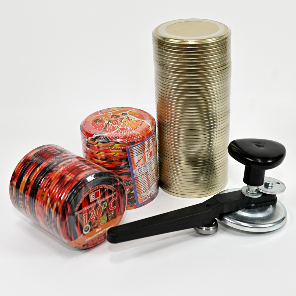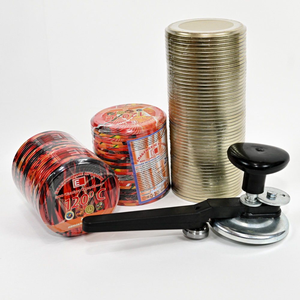 Набор елабужских крышек для автоклавирования СКО 1-82 (100 шт. - в том числе 50 шт. полноцветных и 50 шт. золотых) с автоматической закаточной машинкой «Щелчек» с подшибником на обжимном ролике.- Крышки для консервирования (автоклавирования) закаточные по