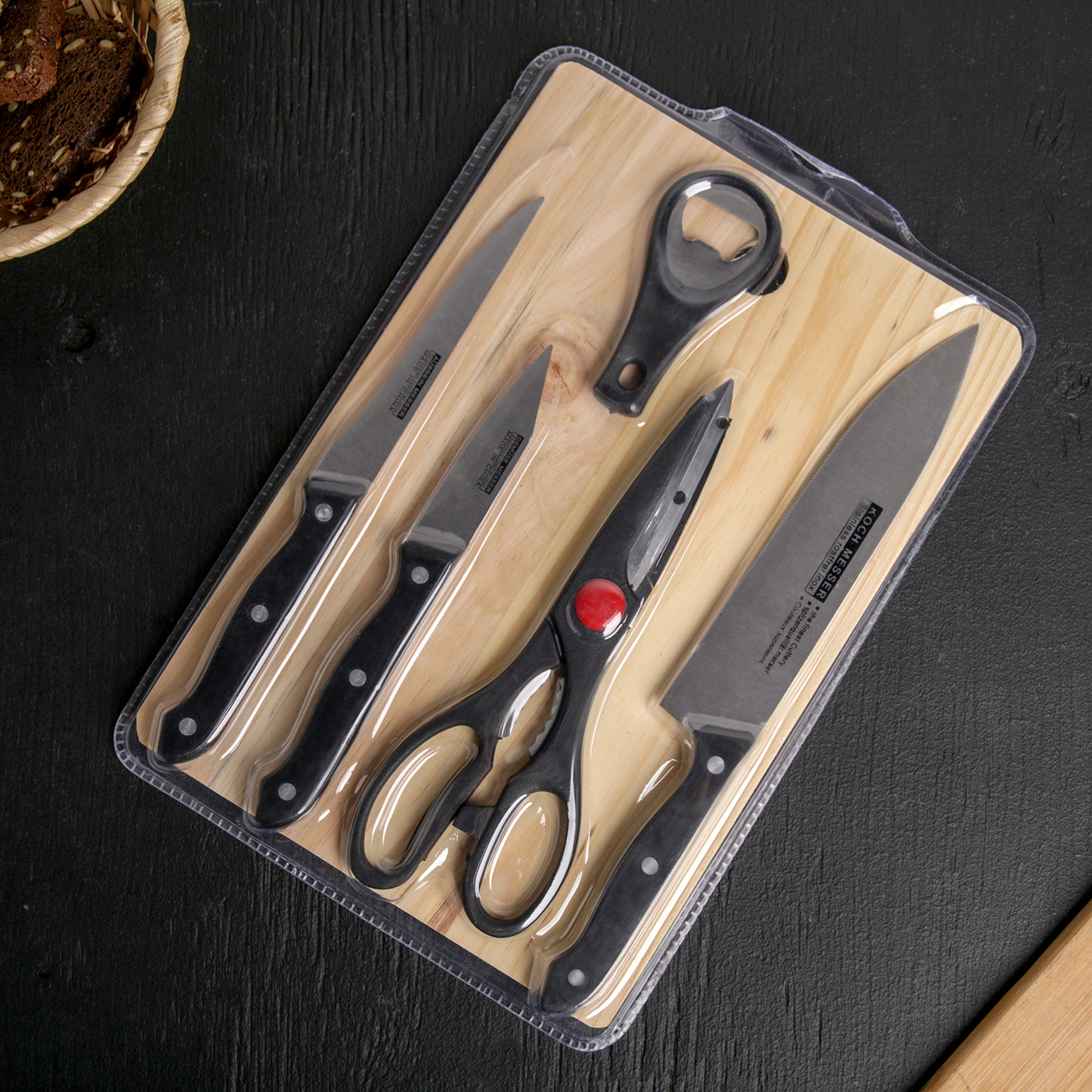 Комплектация:3 ножа ,1 доска,открывалка,ножницы