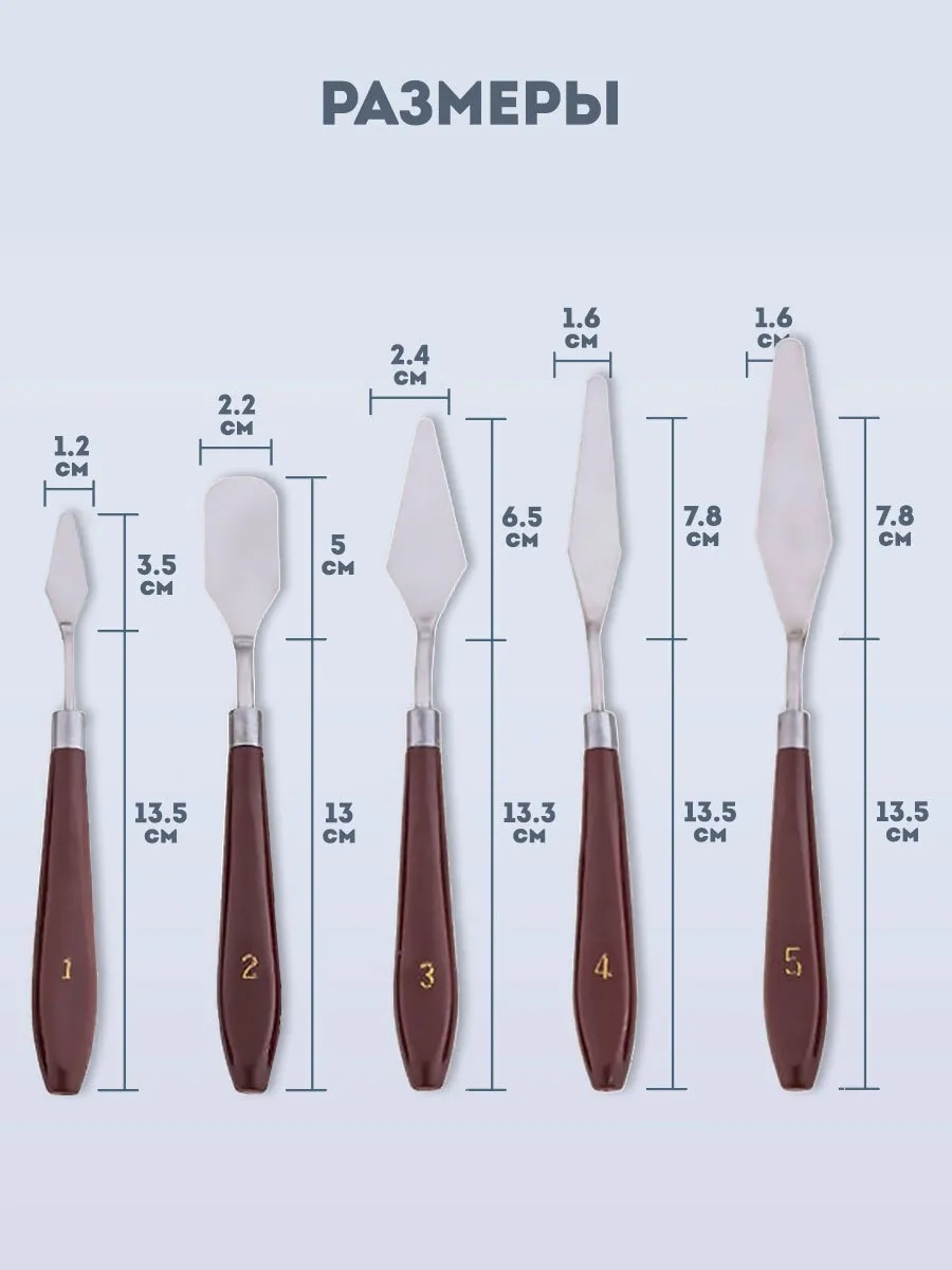 Комплектация:5 шт МастиихиновОписание:Мастихины предназначены для живописи масляными и акриловыми красками. Рабочая часть мастихина - нержавеющая сталь, ручка - дерево бук. В наборе 5 шт