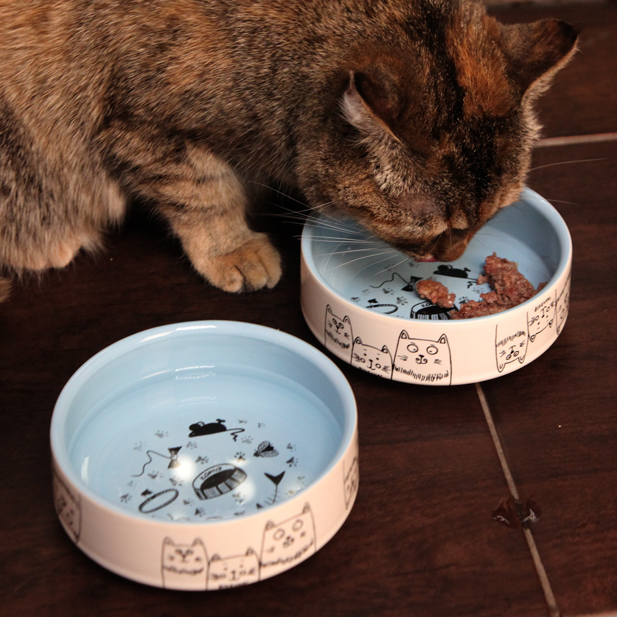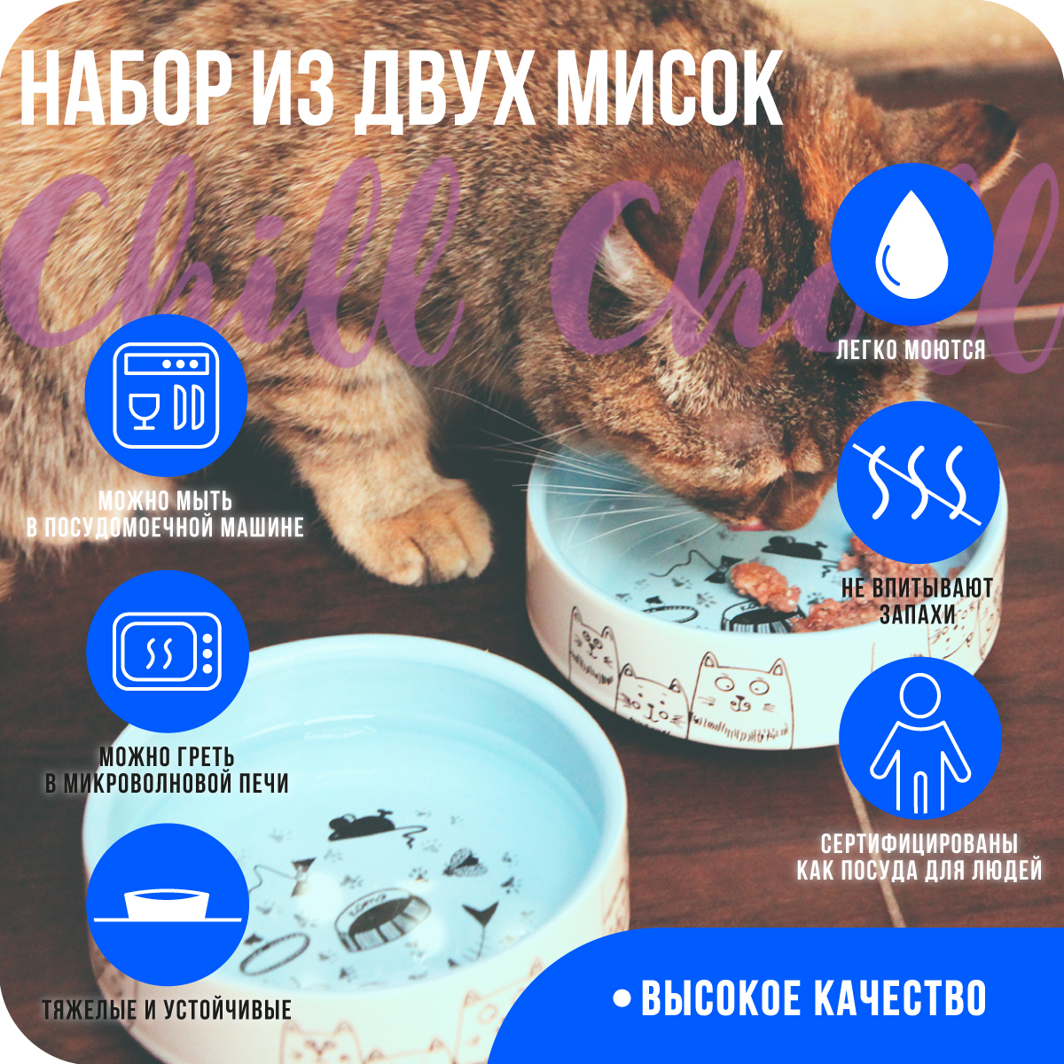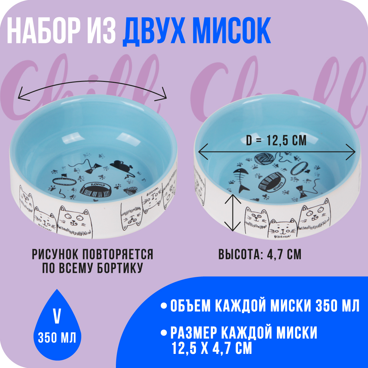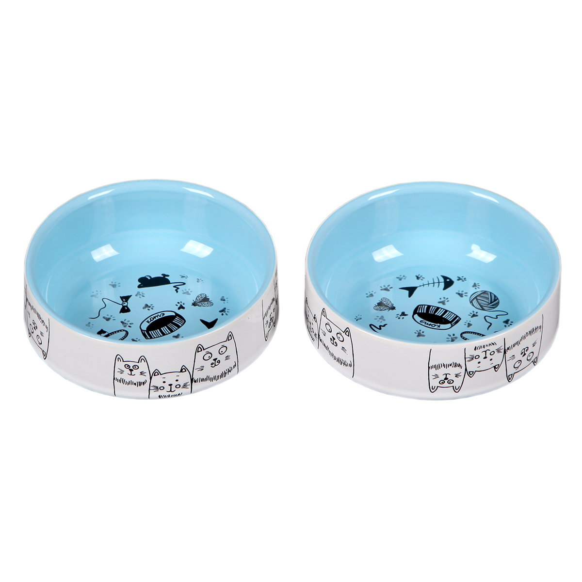 Chill Choll/ Набор мисок 2шт КОШКИ-МЫШКИ /по 350 мл / фарфор/ голубые внутри/ керамические для кошек/для кошки/для кота/для котенкаНабор из двух фарфоровых мисок для кошек и собак объемом по 350 мл.Миски подойдут для кота, для кошки, для котенка, для соба