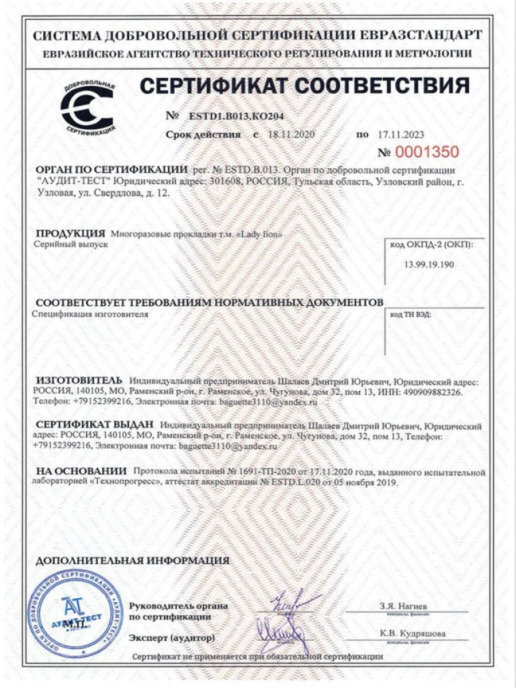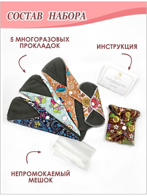 Комплектация:Набор содержит:Прокладка размер L - 1 штПрокладка размер М - 3 штПрокладка размер S - 1 штМешочек непромокаемый для храненияИнструкция по применениюОписание:Многоразовая прокладка "Lady Lion" экологически чистое средство личной гигиены. 1 сло