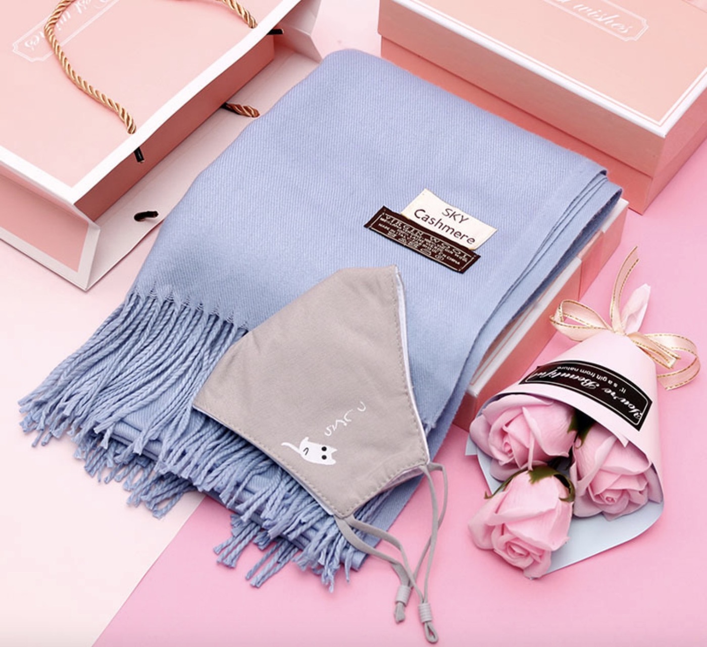 Актуальный и модный подарочный набор со вкусом для девушек и женщин. Качественный кашемировый шарф и практичная маска для лица в красивой подарочной упаковке + декоративный букет из мыльных лепестков роз.