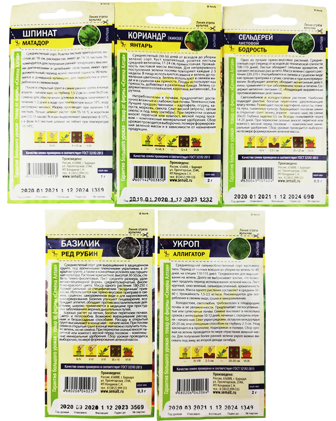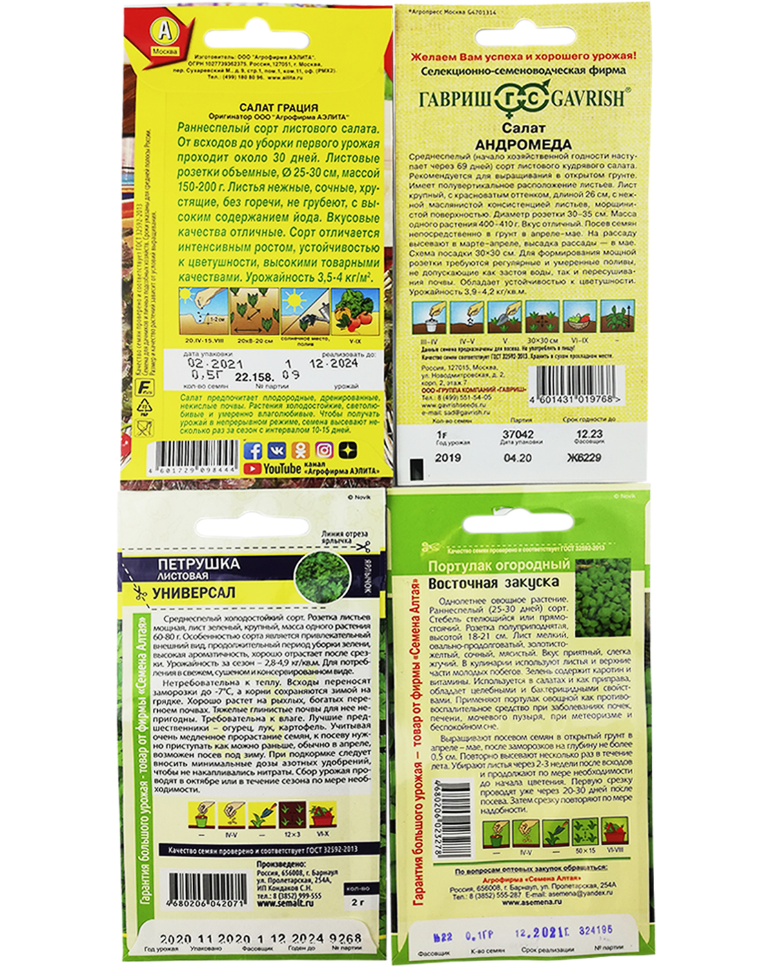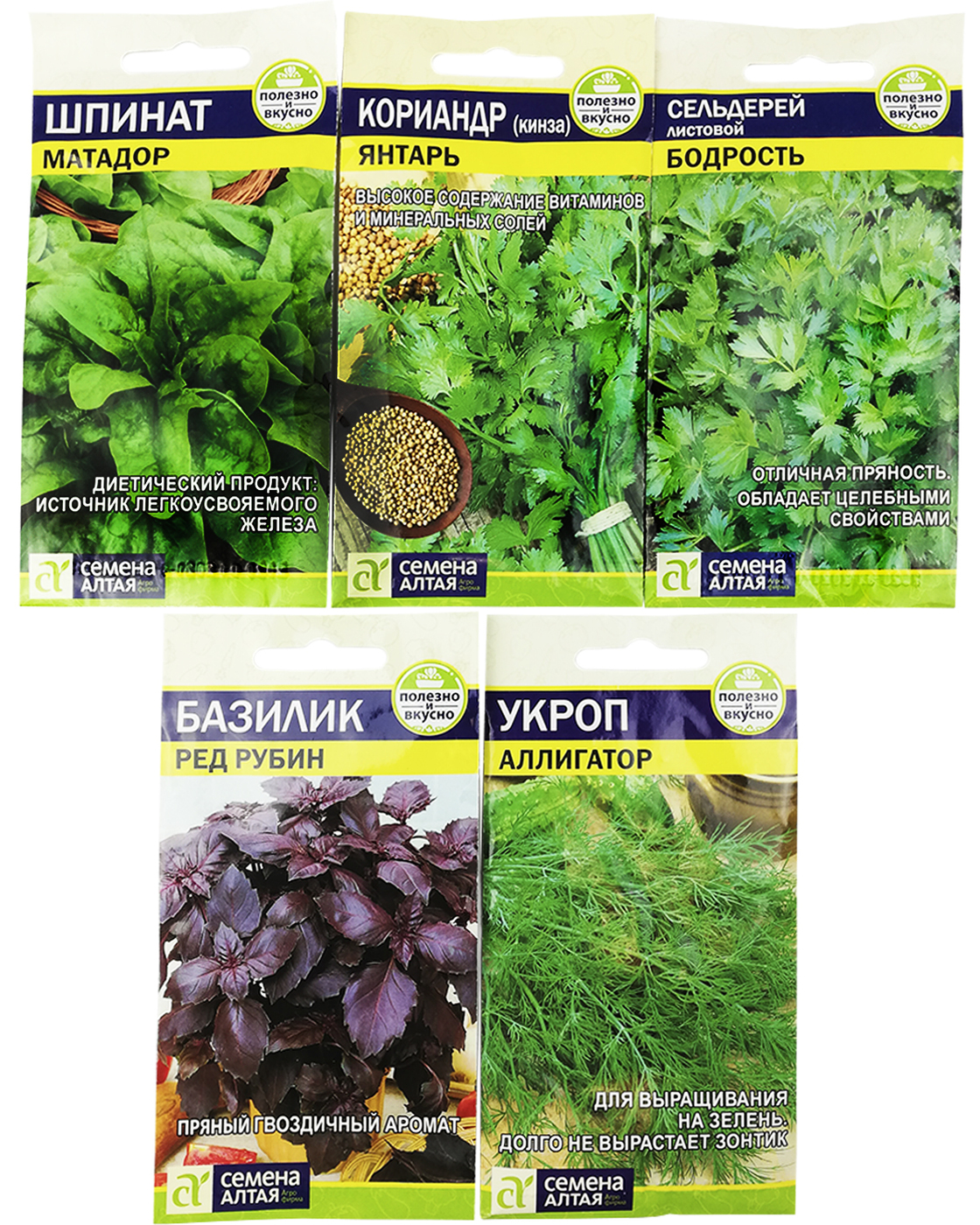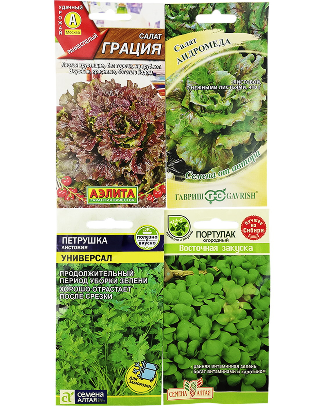 Комплектация:Аэлита :салат грация 0,5 г 1 штГавриш салат андромеда 1 г 1 штСемена Алтая:шпинат матадор 1 г 1 штпетрушка листовая универсал 2 г 1 штпортулак огородный восточная закуска 0,1 г 1 шткориандр ( кинза) янтарь 2 г 1 штсельдерей листовой бодрость