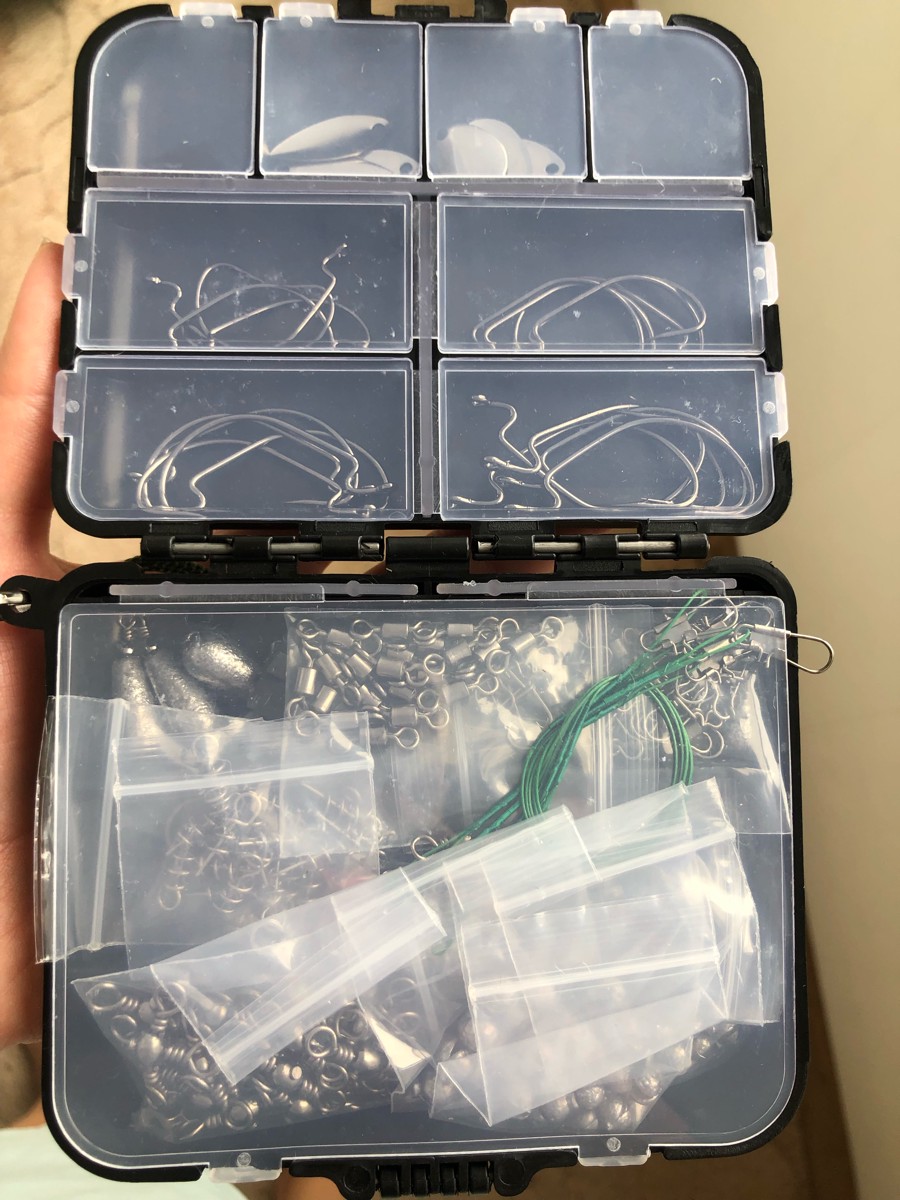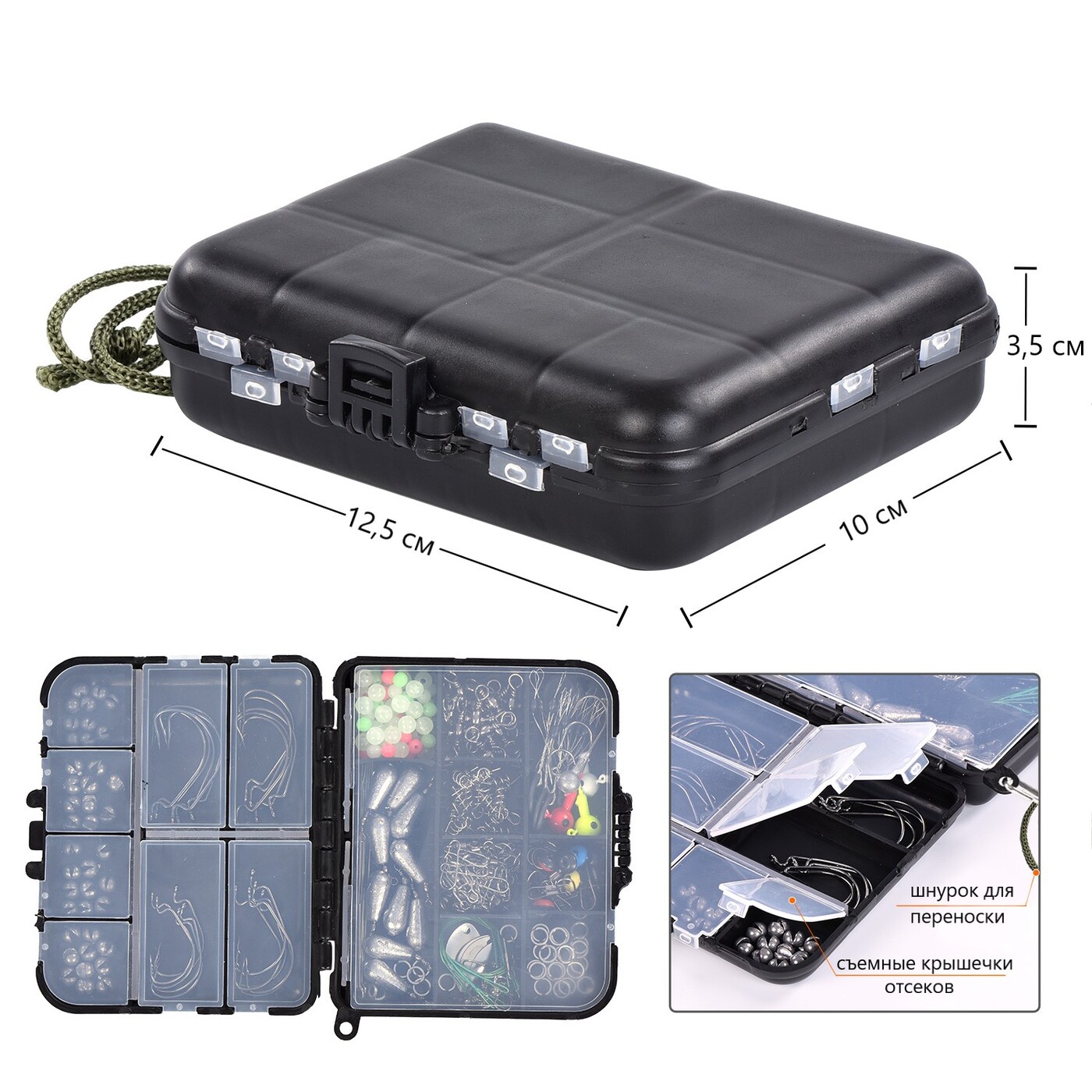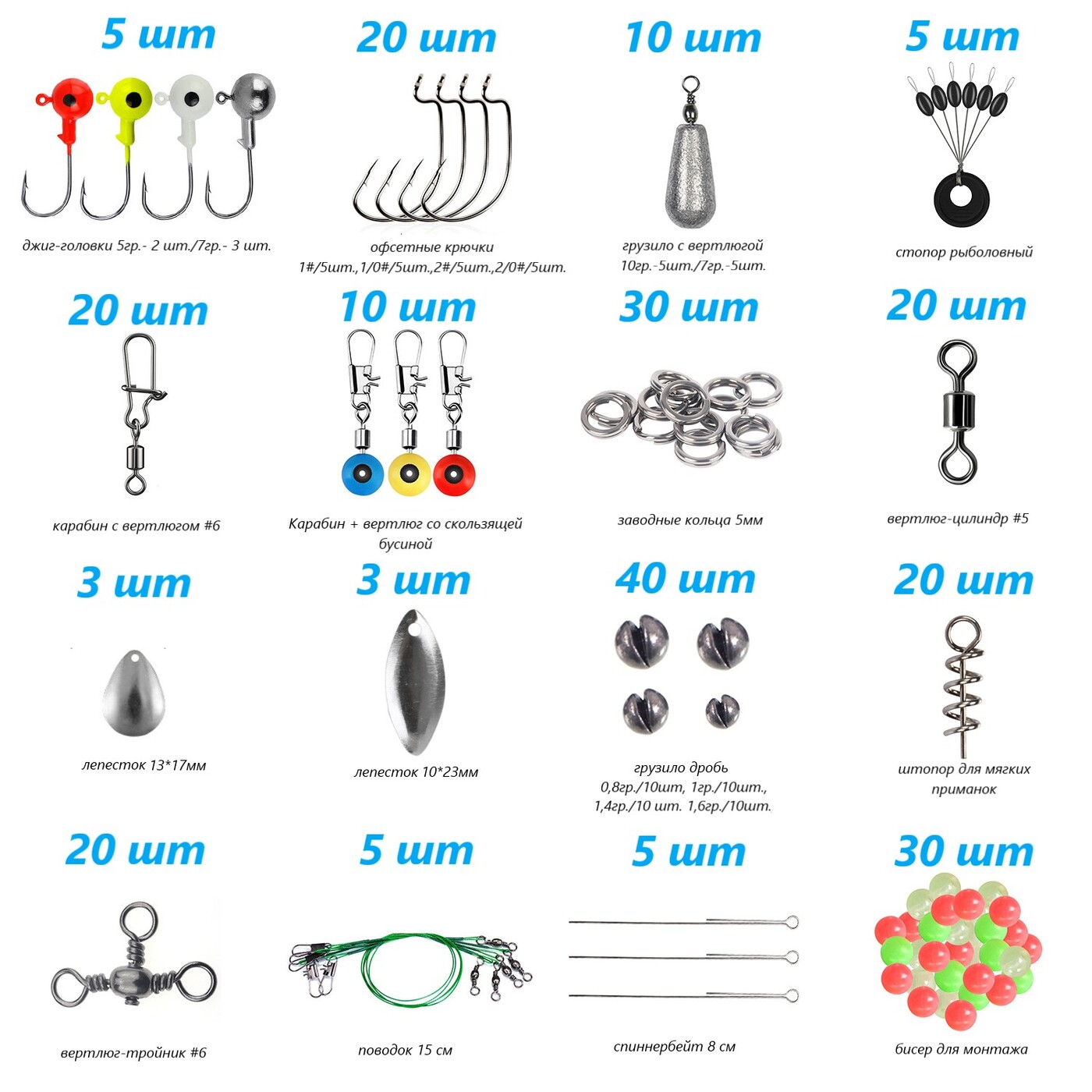 Комплектация:пластиковый кейс - 1 шт.; джиг-головка - 5 шт.; офсетный крючок - 20 шт.; грузило с вертлюгом - 10 шт.; стопор рыболовный - 5 шт.; карабин с вертлюгом - 20 шт.; карабин + вертлюг с бусиной - 10 шт.; заводное кольцо - 30 шт.; вертлюг-цилиндр