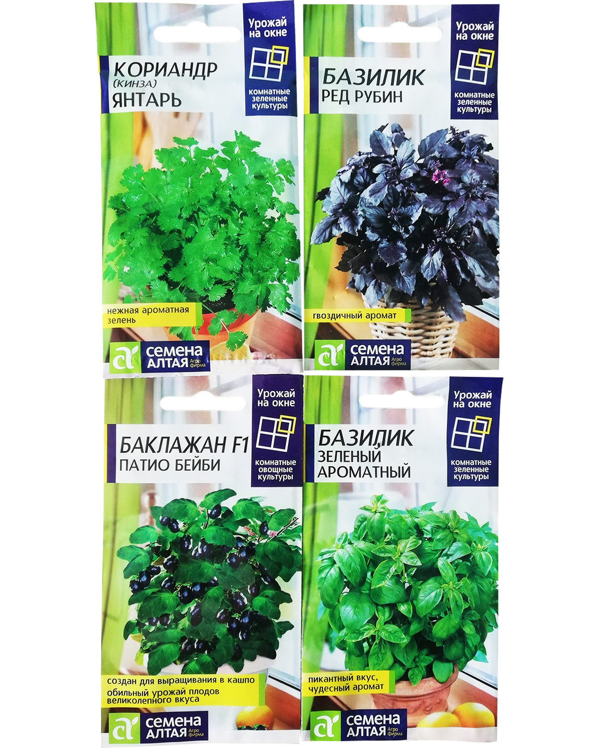 Комплектация:Томат Комнатный сибиряк - 0,05 г 1 шт Баклажан Патио Бейби F1 - 5 шт. семянТомат Золотце - 0,05 г 1 штЛук На зелень - 0,5 г 1 штПерец острый Огненный вулкан - 0,2 г 1 штБазилик Ред Рубин - 0,3 г 1 штКориандр (кинза) Янтарь - 2 г 1 штБазилик з