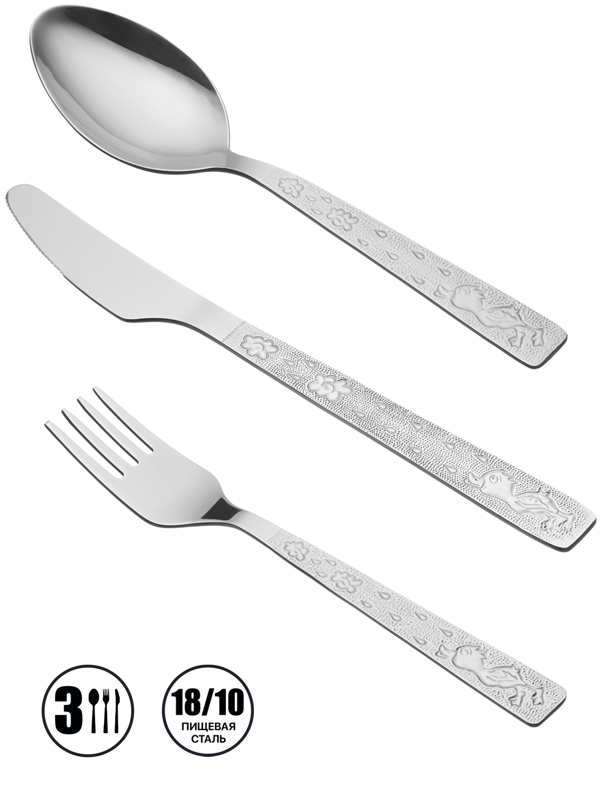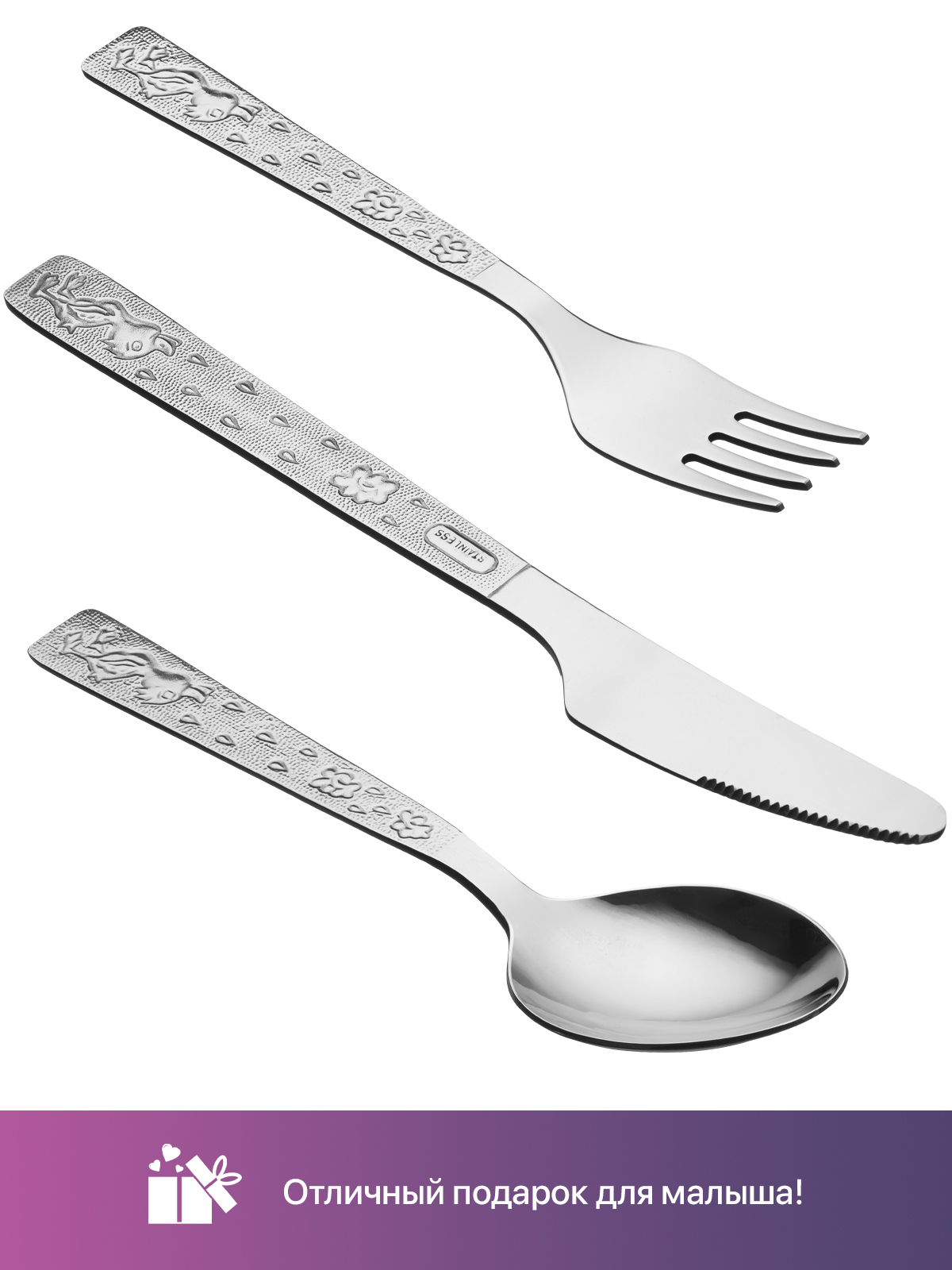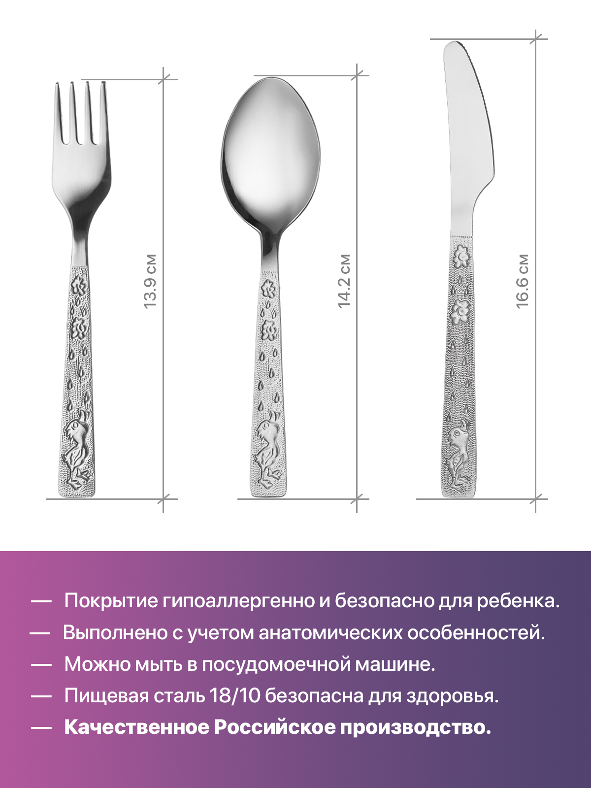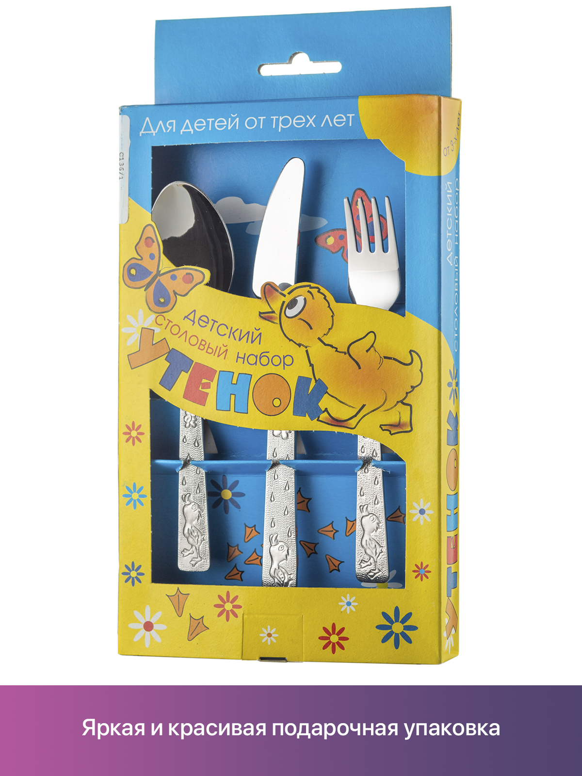 Комплектация:Ложка детская, вилка детская, нож детский, подарочная упаковкаОписание:Набор детских столовых приборов "Утенок" включает в себя 3 предмета: ложка детская, вилка детская, нож детский. Столовые приборы набор предназначен для детей старше трех л