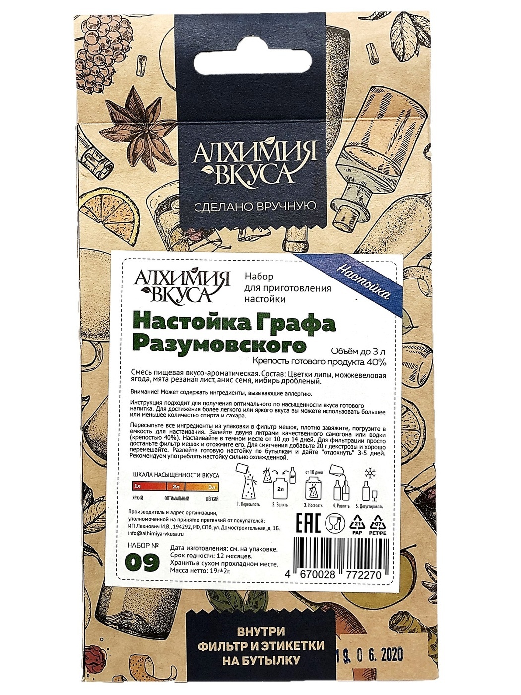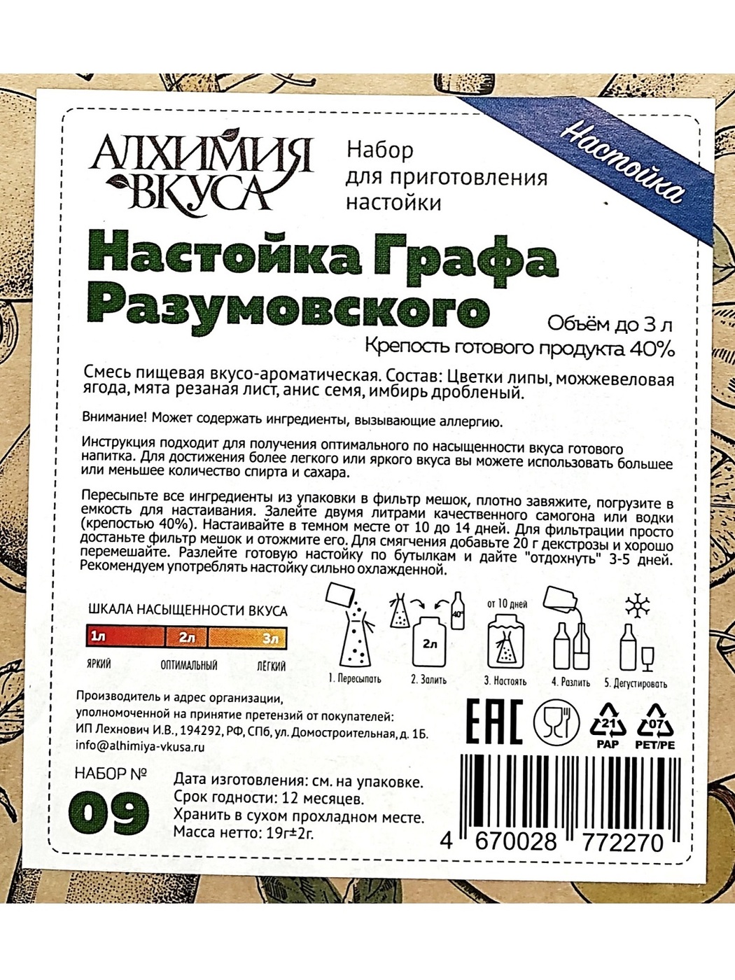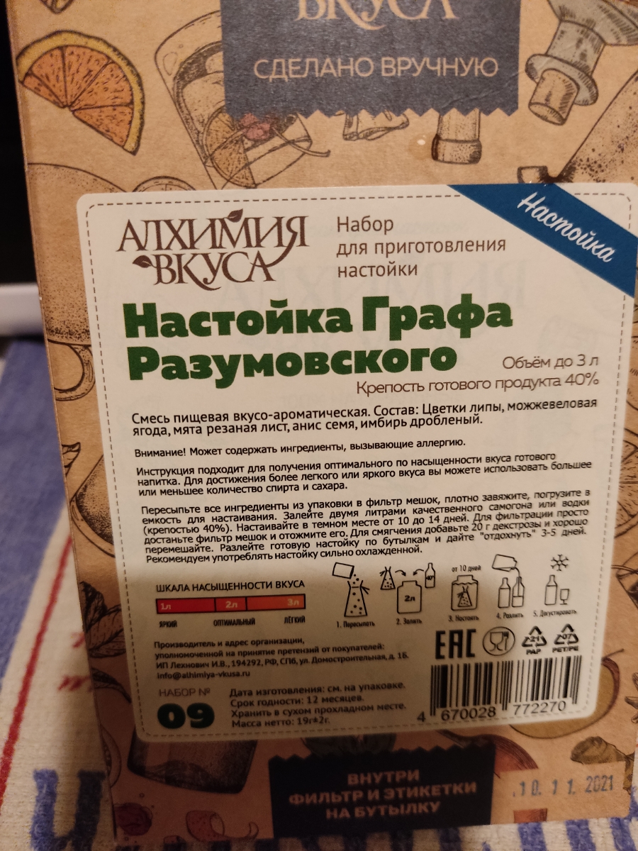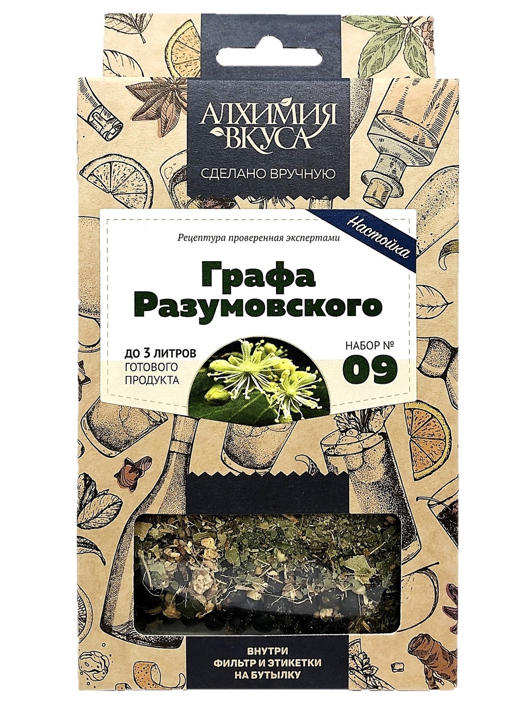 Набор для приготовления настойки Настойка Графа Разумовского - пищевая вкусо-ароматическая смесь для приготовления настойки, в состав которой входят: цветки липы, можжевеловая ягода, мята резаная лист, анис семя, имбирь дробленый. Набор рассчитан на приго