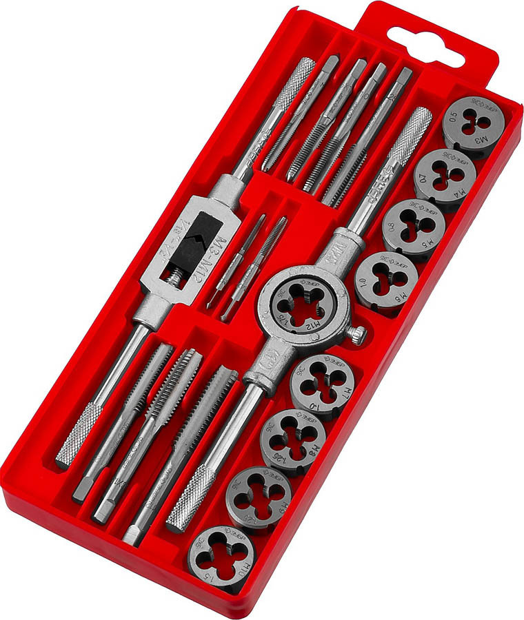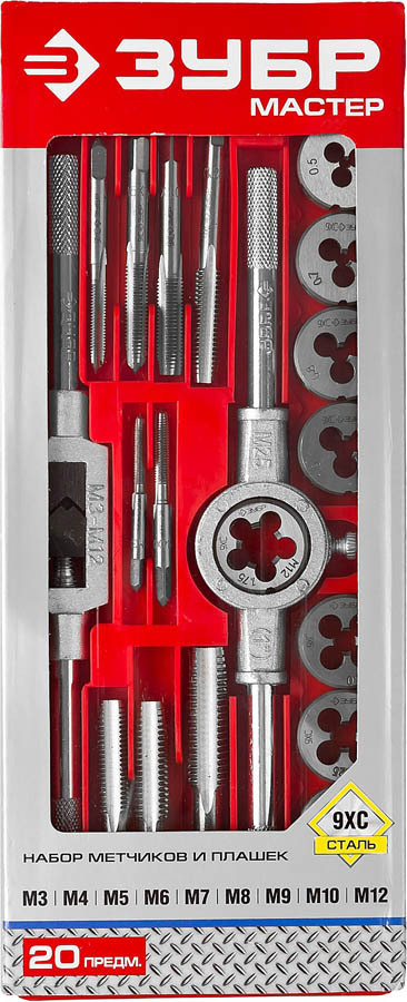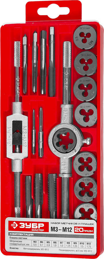 Комплектация:Плашки – 9 шт. Метчики – 9 шт. Метчикодержатель М3-М12 -1 шт. Плашкодержатель Д25(М3-М12) - 1шт.Описание:Набор резьбонарезной ЗУБР 2810-H20_z01, предназначен для нарезания внутренней метрической резьбы с нормальным и мелким шагом и трубной ре
