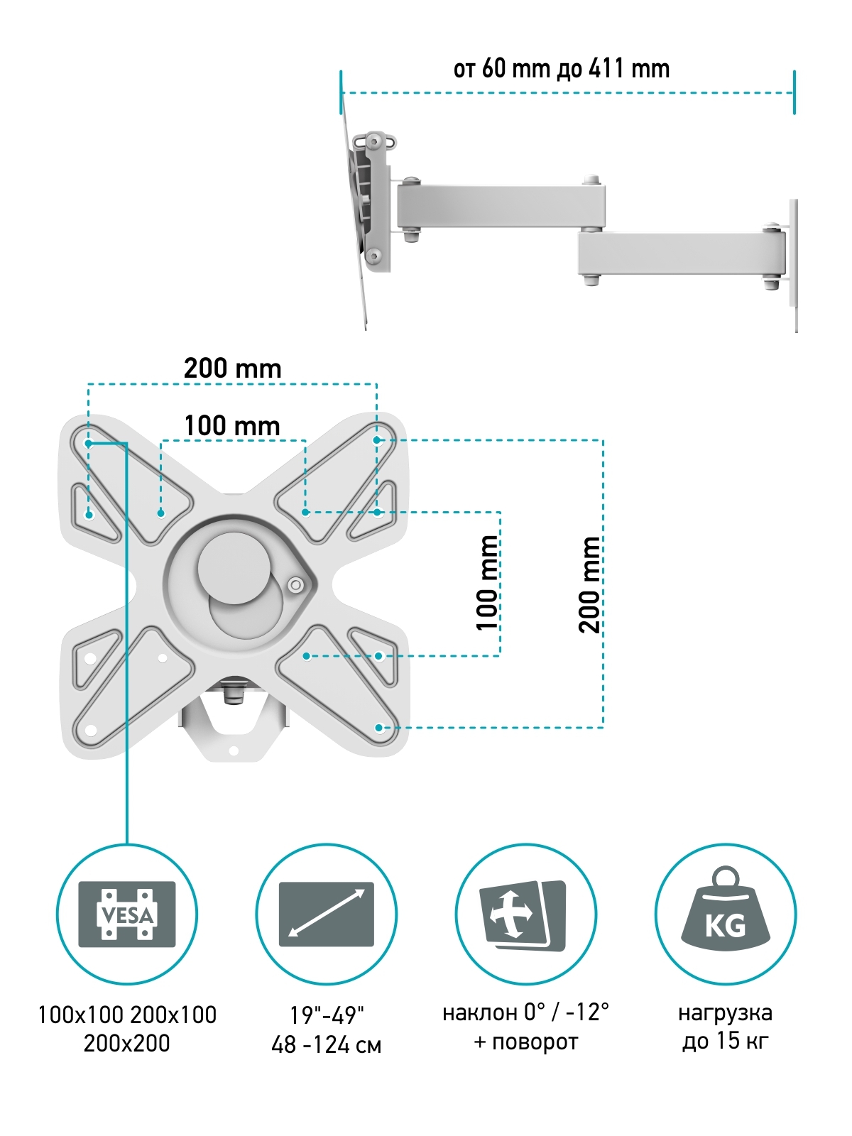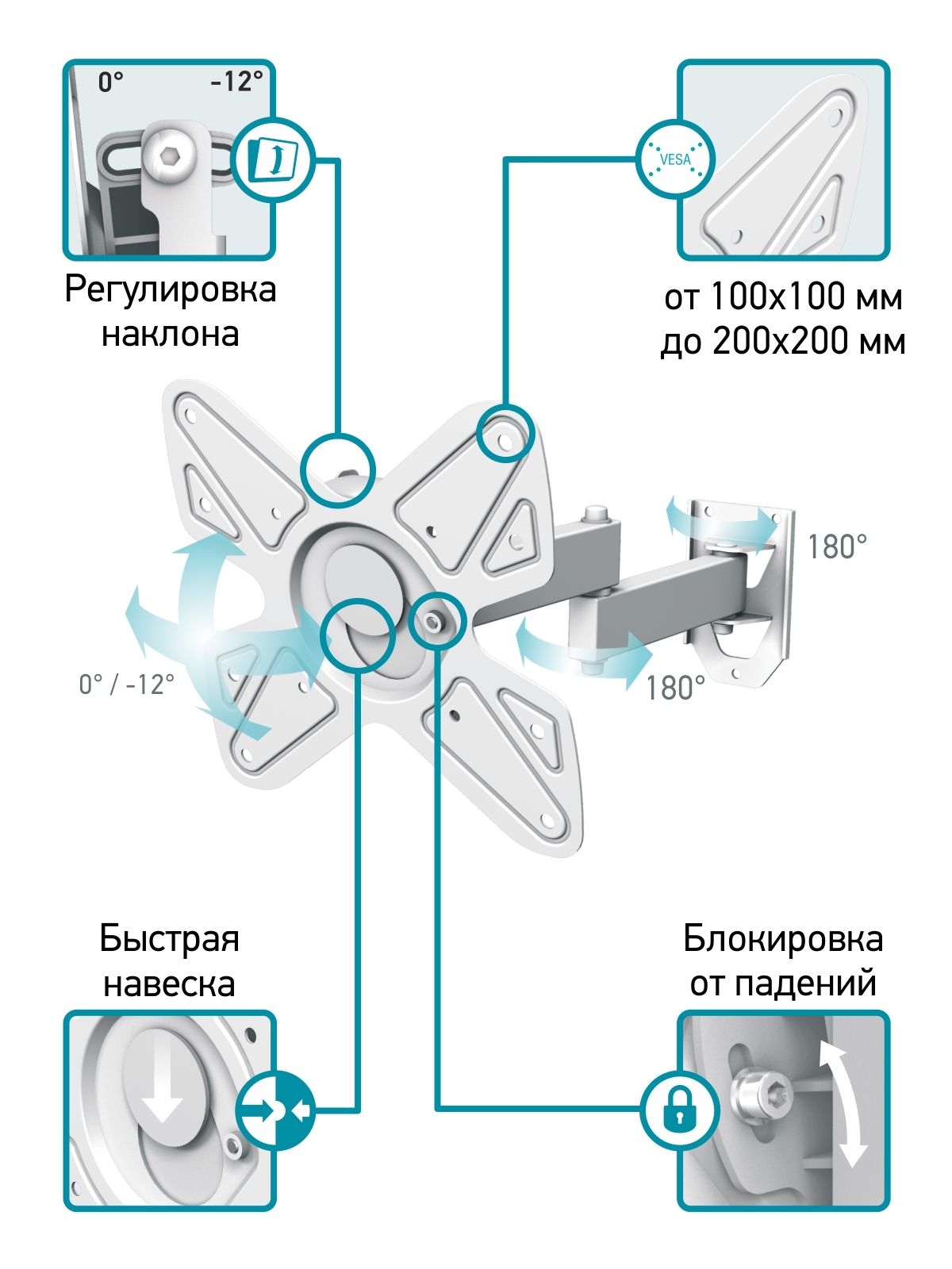 Регулировка крепленияНаклон, Поворот, Выдвижение, Вращение