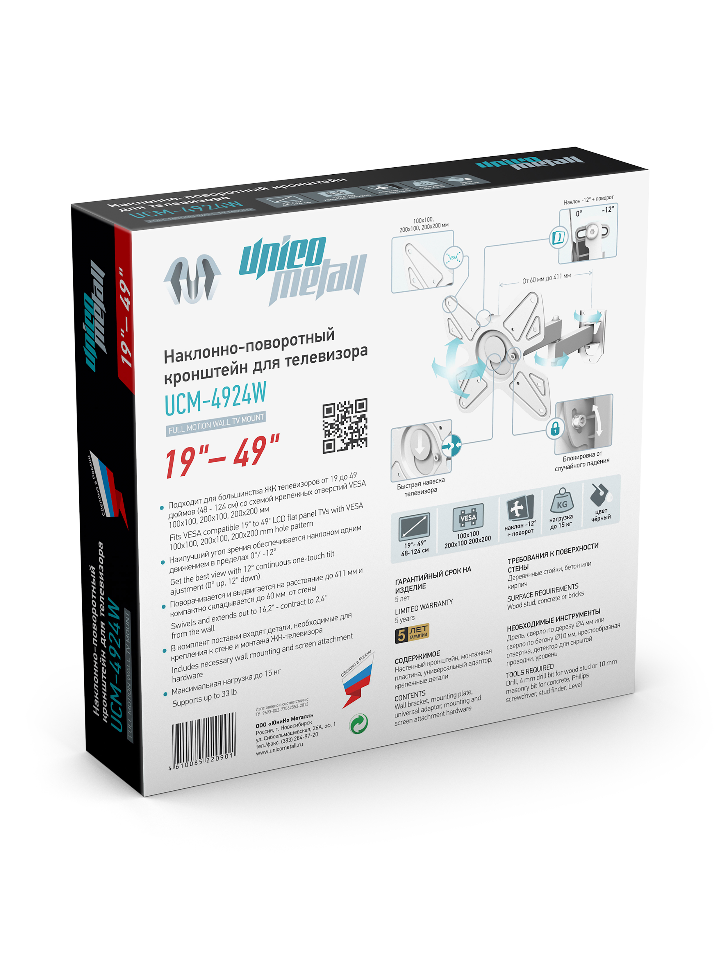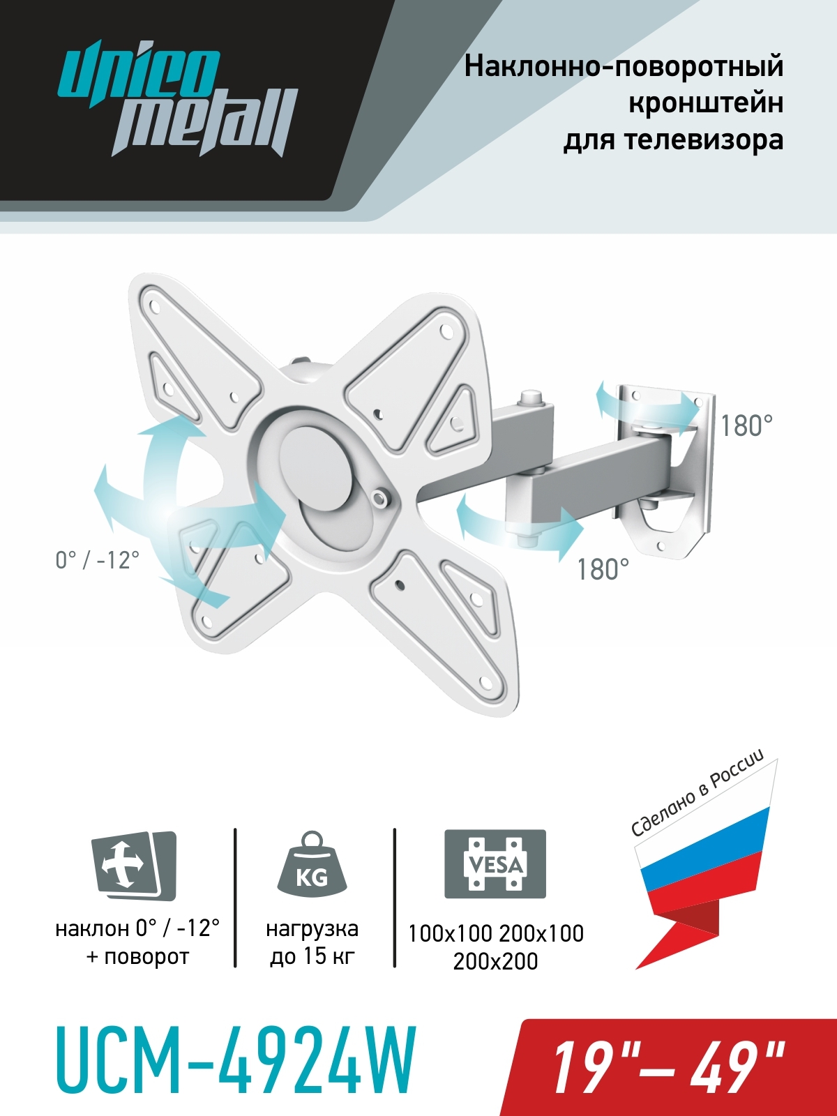 Ищете кронштейн в белом цвете, который удачно впишется в современный интерьер в стиле минимализма или хай-тек? Вот он!Наклонно-поворотный кронштейн для крепления телевизора на стену UCM-4924W предоставит вам возможность смотреть телевизор из любой точки к