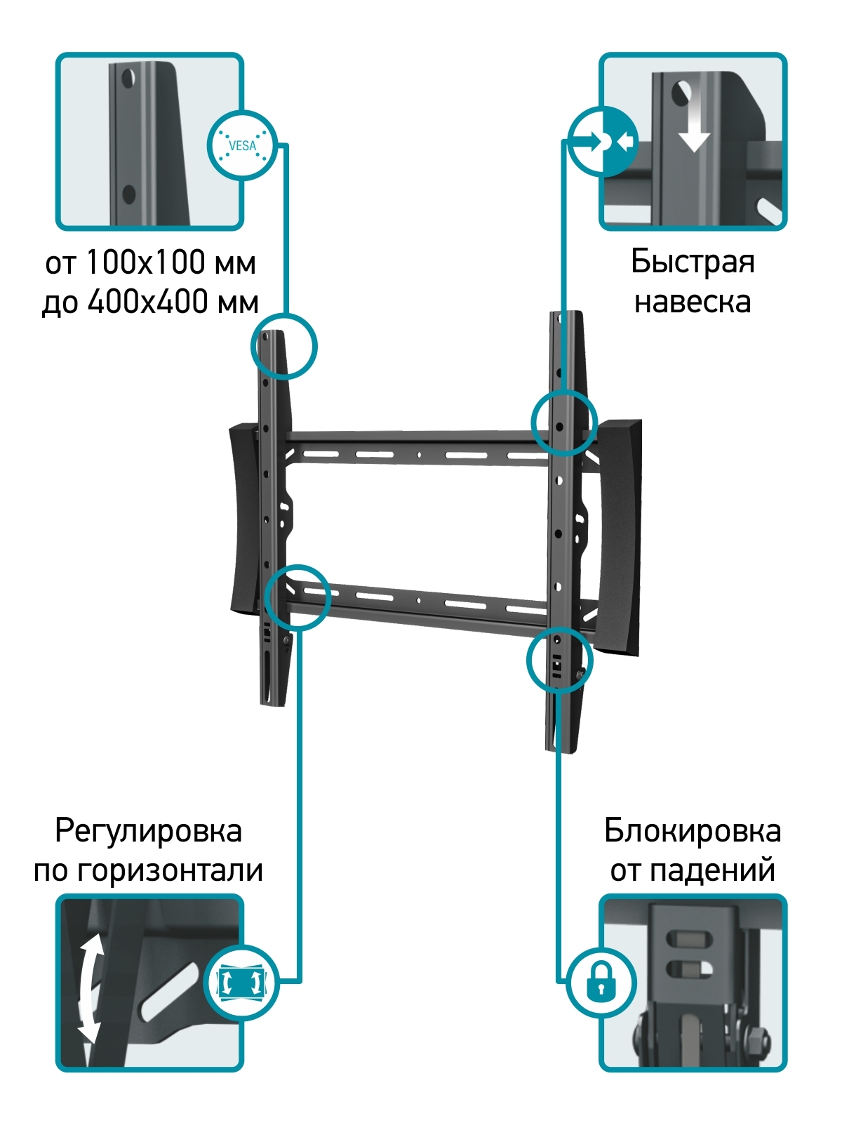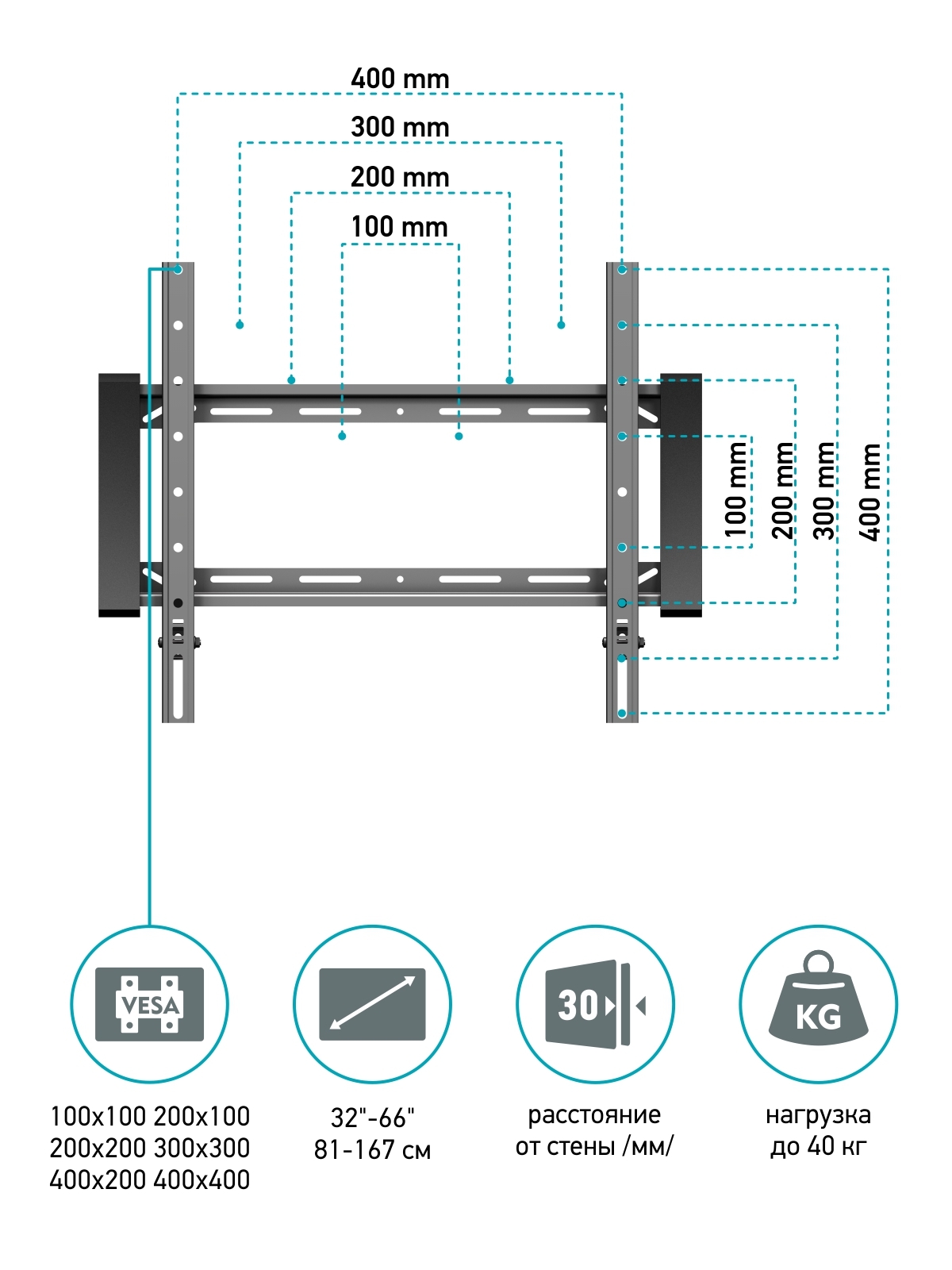 Настенное крепление (VESA)400x400 мм, 300x300 мм, 200x300 мм, 200x200 мм, 100x100 мм, 100x200 мм, 200x100 мм