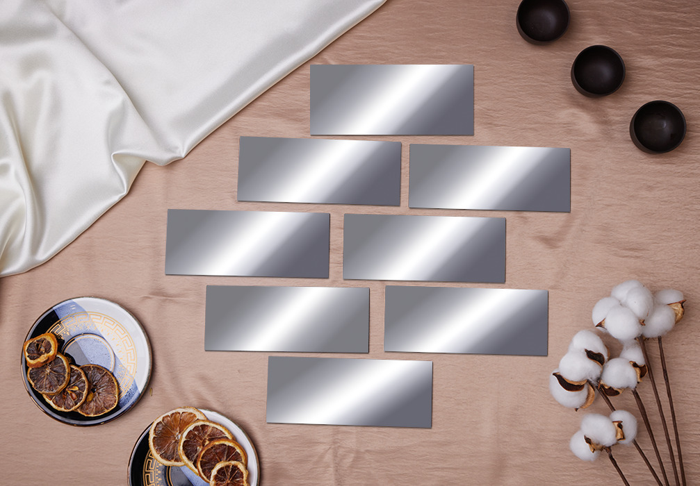 Комплектация:12 плиточекОписание:Зеркальная плитка размером 6х15см изготовлена из выскокачественного зеркального акрила марки Gebau, с обратной стороны на плитку нанесён двусторонний скотч, для простого и удобного наклеивания на стену.Интерьерные наклейки