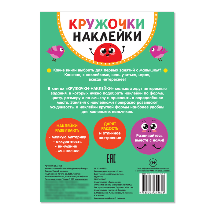Набор: Нет;Возраст: От 2 лет;Количество страниц: 16;Год издания: 2018;Тематика: Геометрия;Тематика: Животный мир;Развитие навыков: Фигуры, цвета;Тема обучения: Окружающий мир;Вид наклейки: Бумажная;Тип обложки: Мягкий переплёт;Автор: Сачкова Евгения Камил
