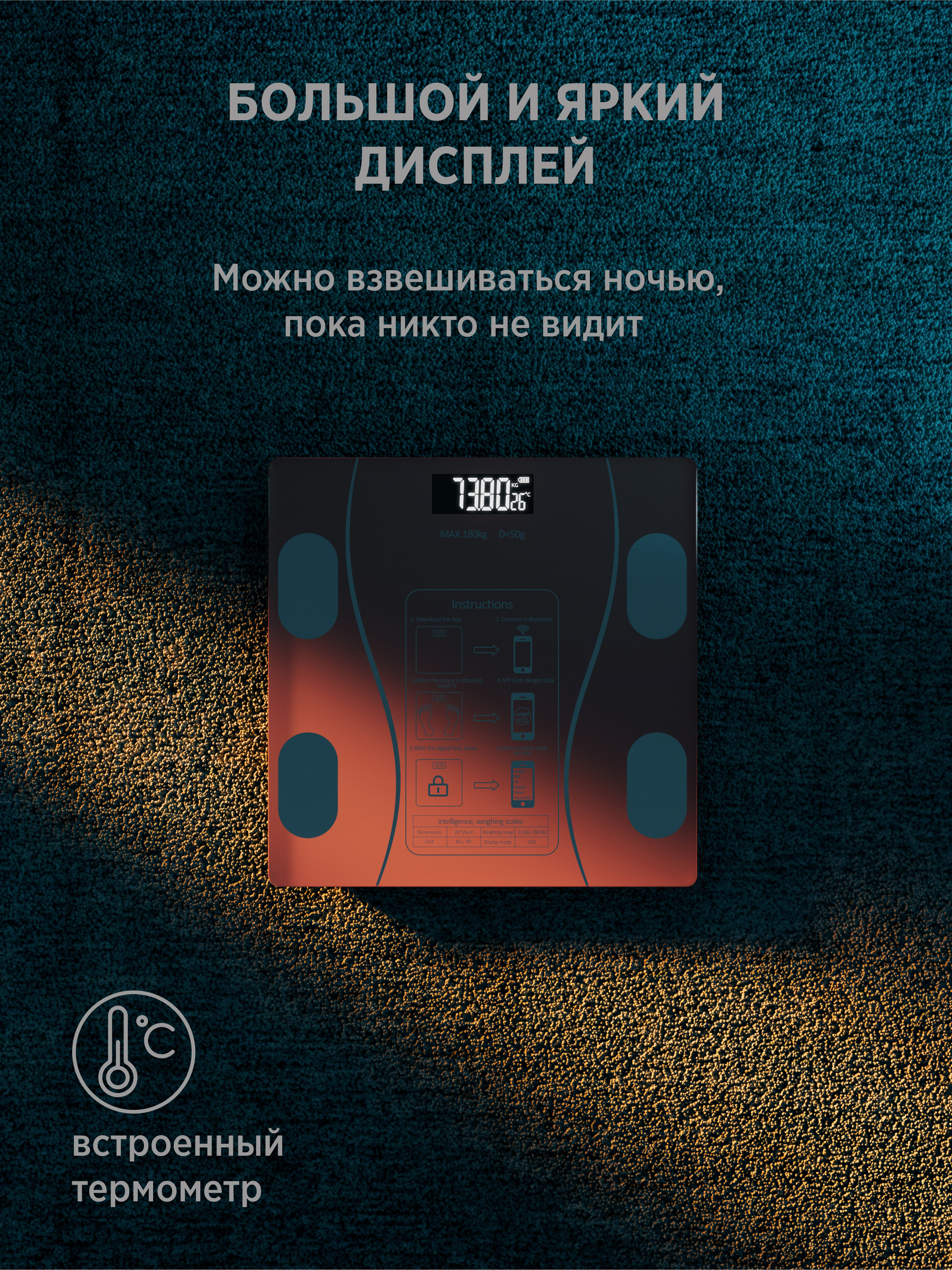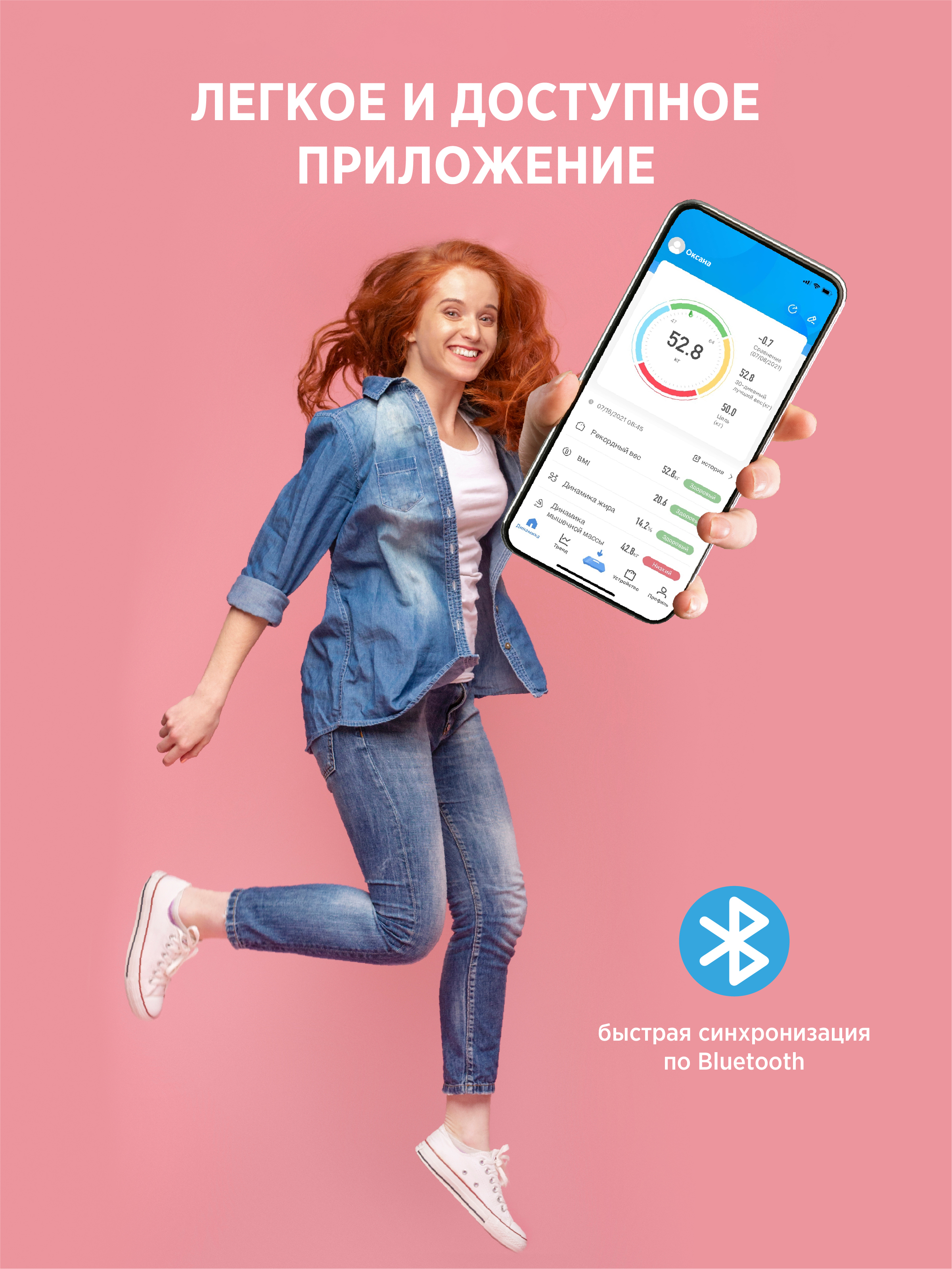 Умные электронные диагностические весы – идеальный помощник для контроля за весом, процентным содержанием жира, воды и мышц. Умные напольные весы совместимы с любыми телефонами Android, iOS. Синхронизация происходит быстро. После того, как произошло взвеш