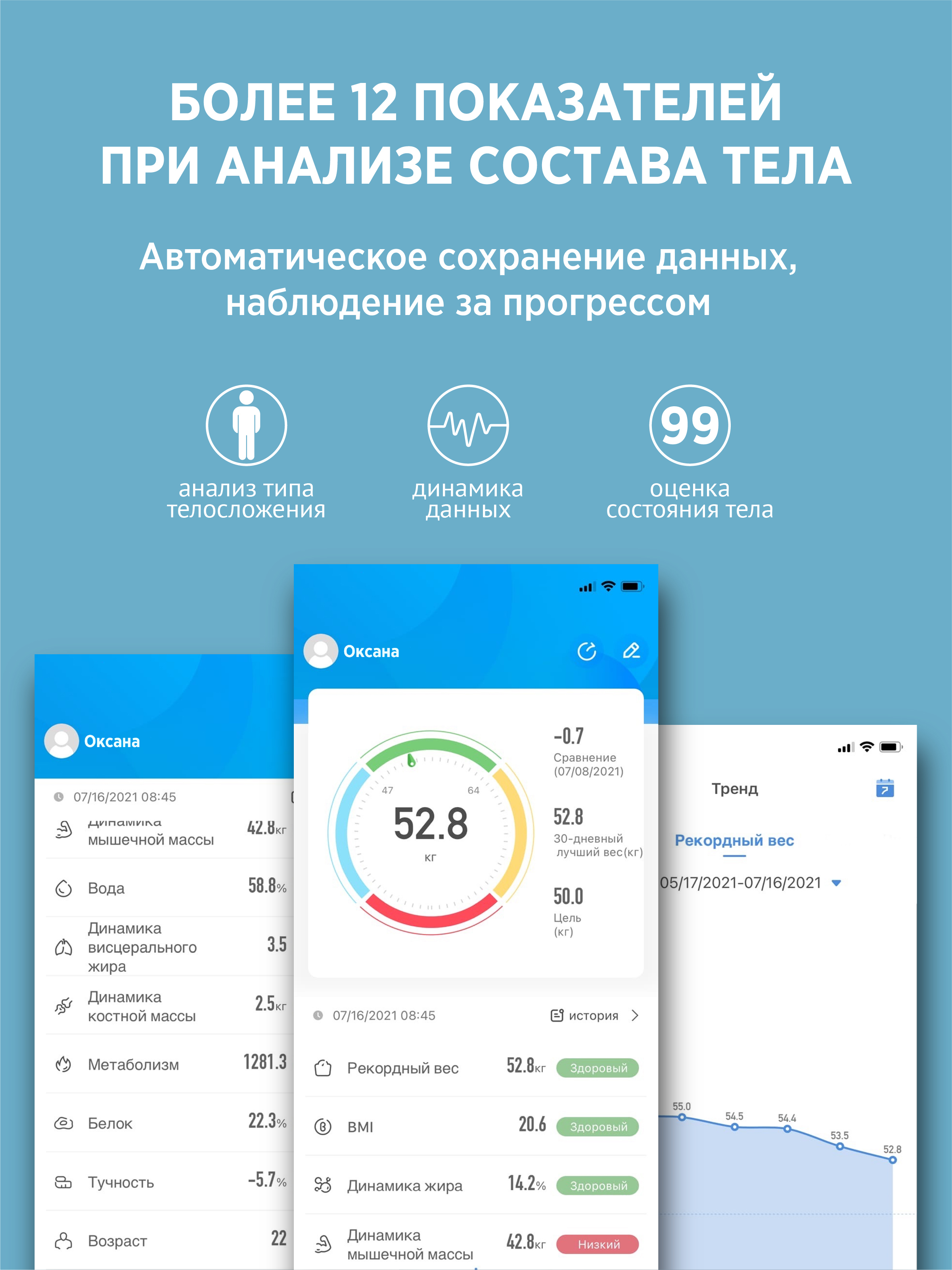 ИзмеренияВес, Жировая масса, Мышечная масса, Костная масса, Индекс массы тела, Метаболизм, Висцеральный жир, Измерение белка