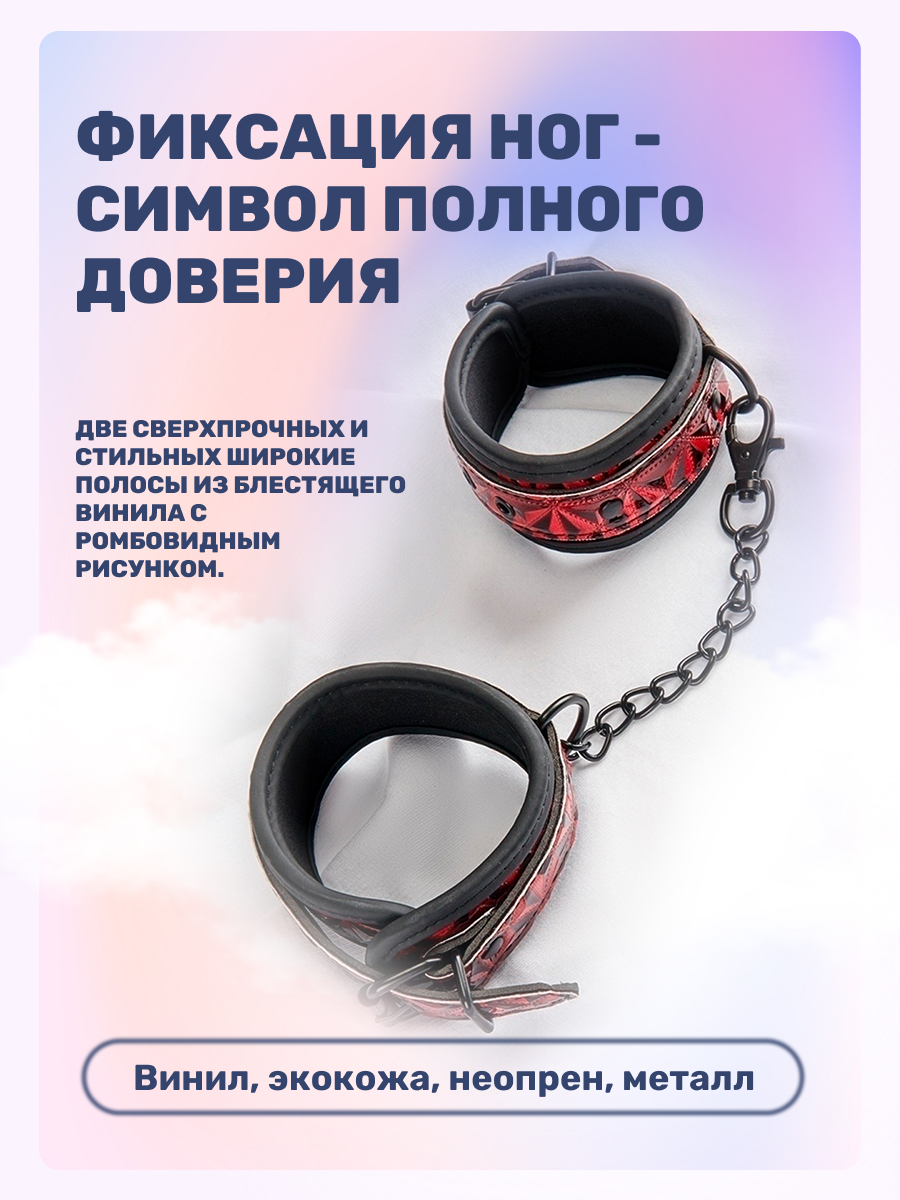 Состав комплекта:Наручники на ногиСостав:Полиуретан,винилОписание:Браслеты на лодыжки Luxury Ankle Cuffs - специализированное приспособление для обездвиживания партнера при эротических ролевых играх и практиках БДСМ. Фиксаторы состоят из двух сверхпрочных