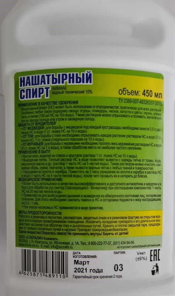 Комплектация:Объем: 450мл.Описание:Нашатырный спирт позволяет решить множество бытовых задач дома и на даче. Средство применяется во время стирки для лучшего пенообразования и для удаления пятен. Используется для подкормки комнатных и декоративных растени
