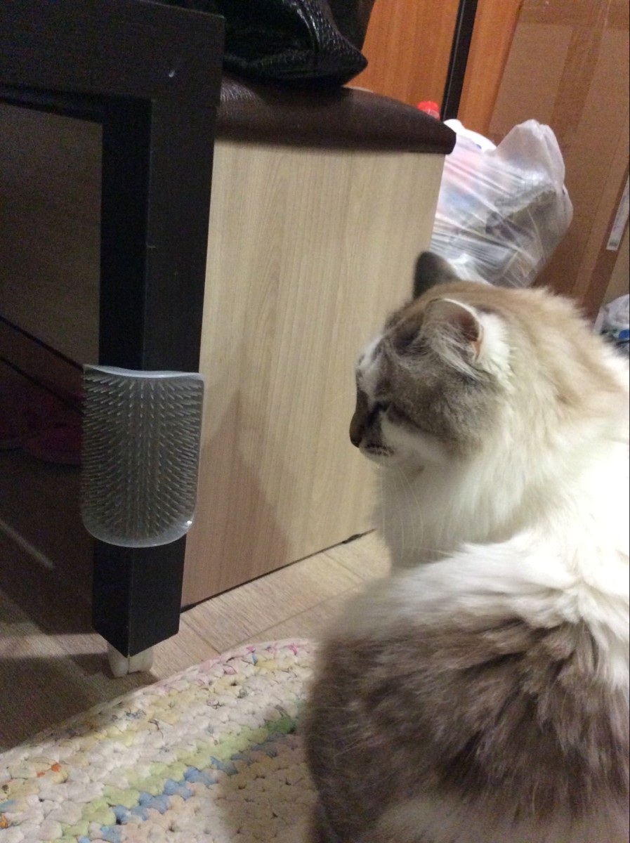 Этот массажер отличается максимальным удобством в эксплуатации. Ваша задача – просто прикрепить его к стене или любому углу с помощью двух клейких лент или шурупов (входят в комплект). Пластиковые щетинки легко удалят отмершую шерсть, расчёсывают, массажи