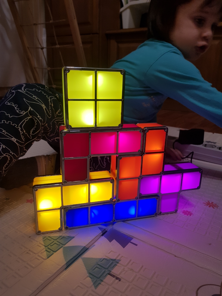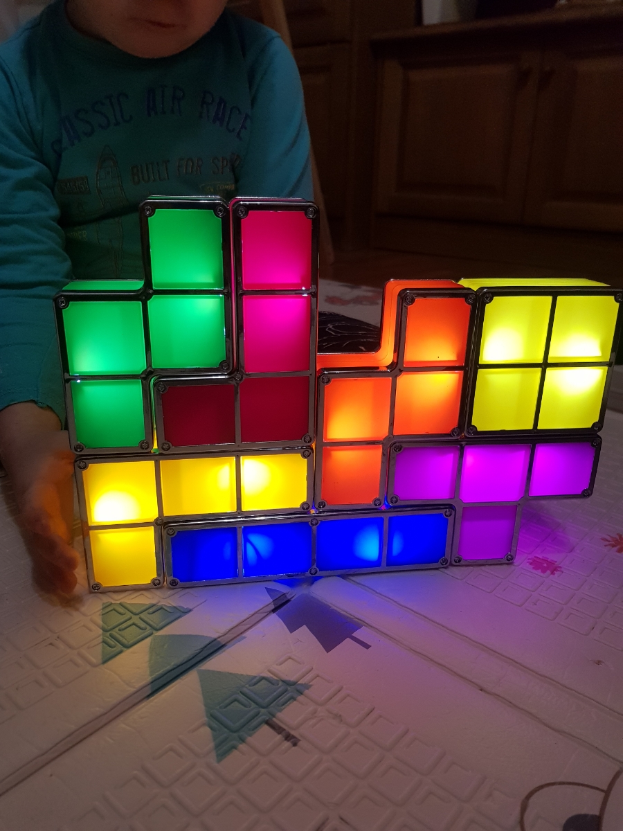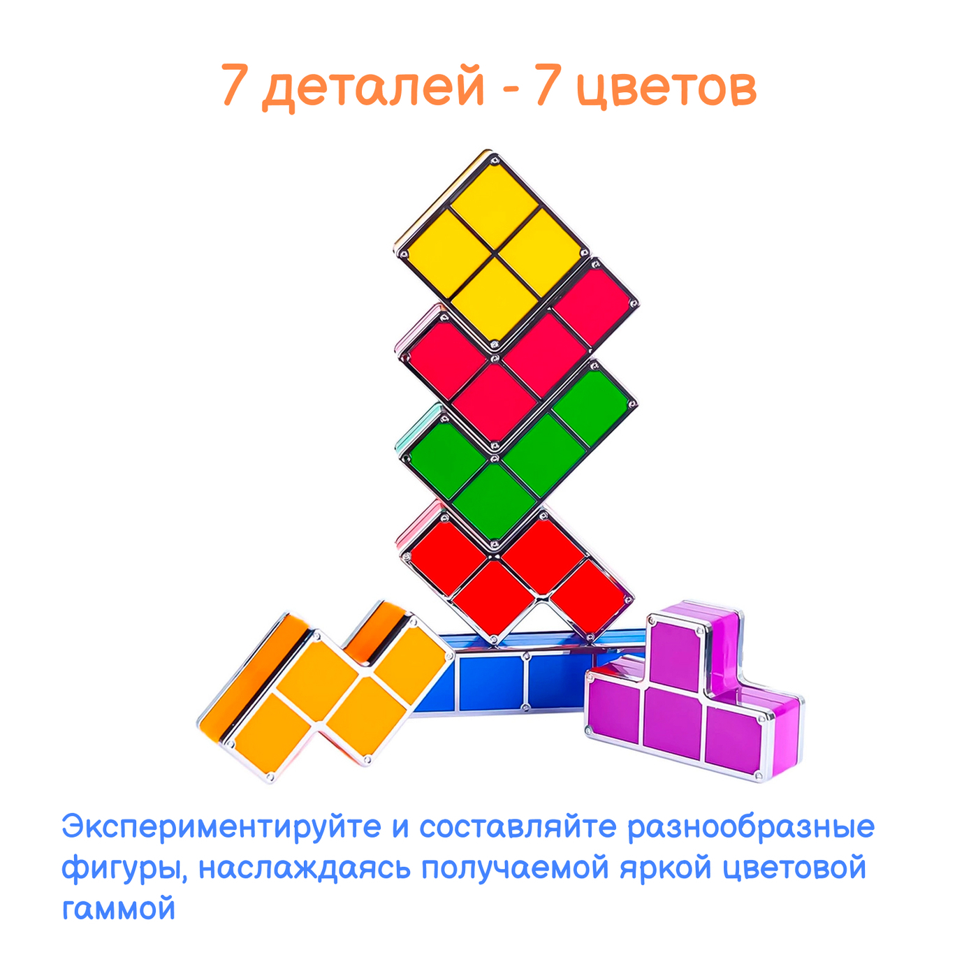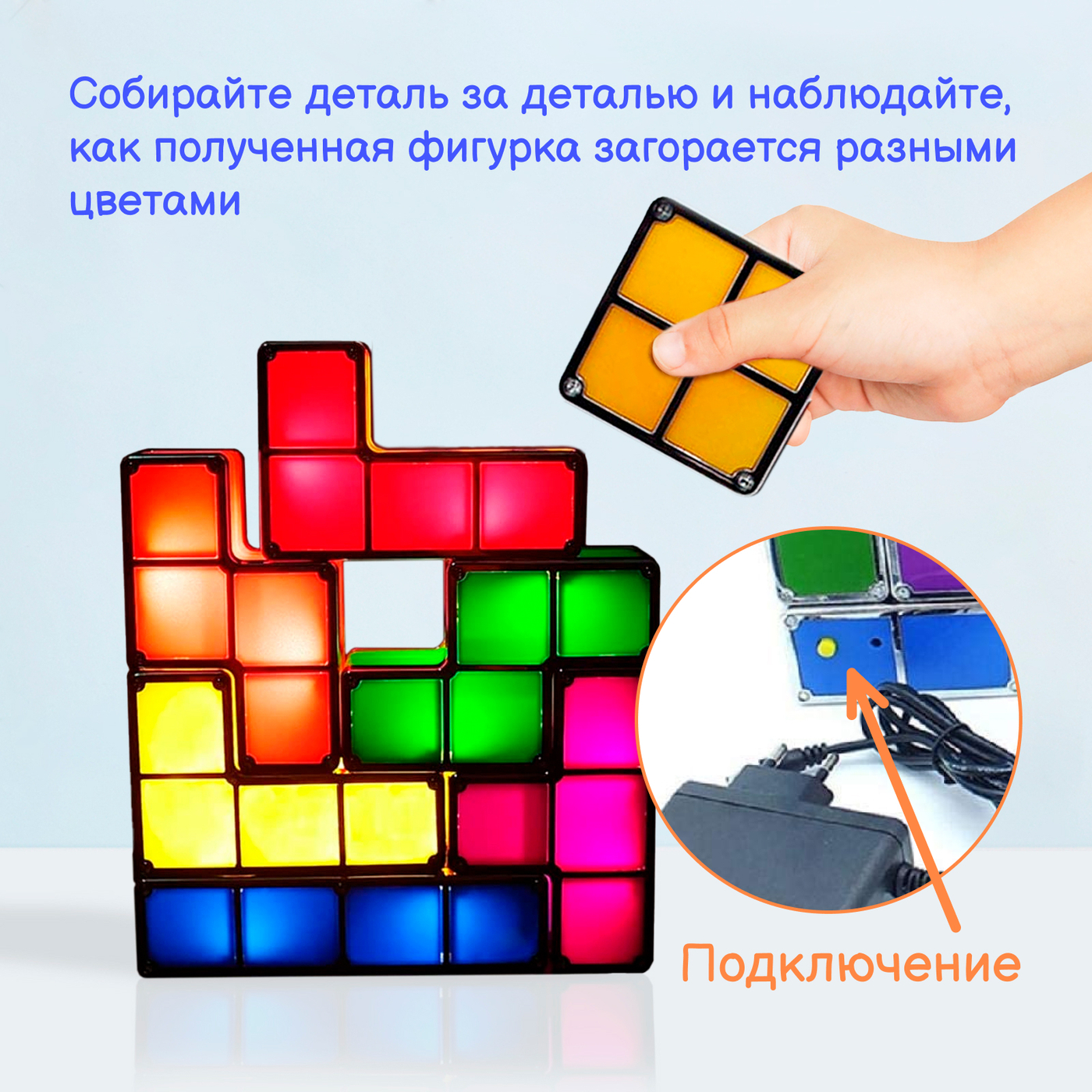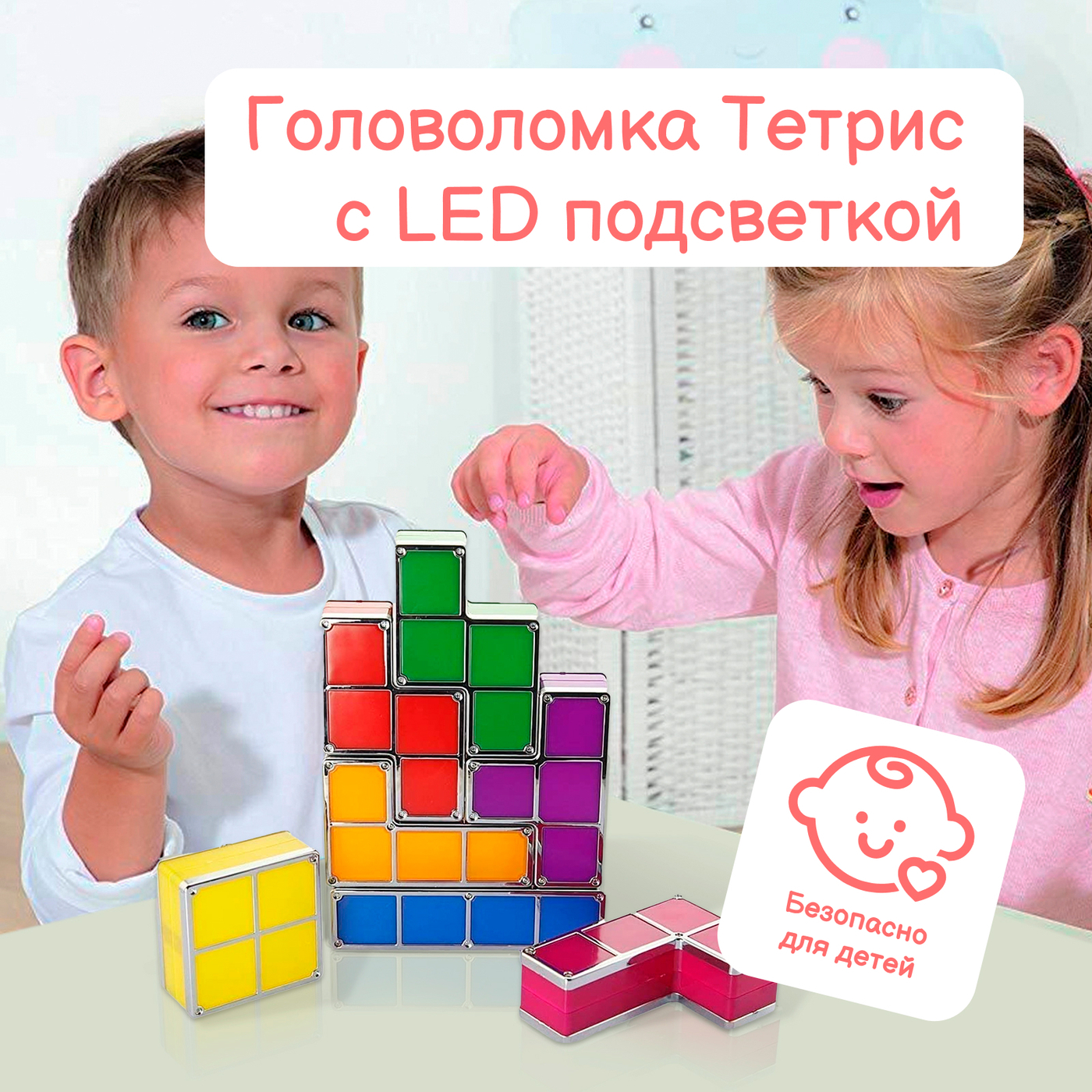 Яркая детская игрушка головоломка в виде Тетриса, который светится при соединении деталей друг с другом. Переставляйте фигурки как угодно - они будут светиться разными цветами! Единственное условие - LED фигурки должны касаться металлическими кромками дру