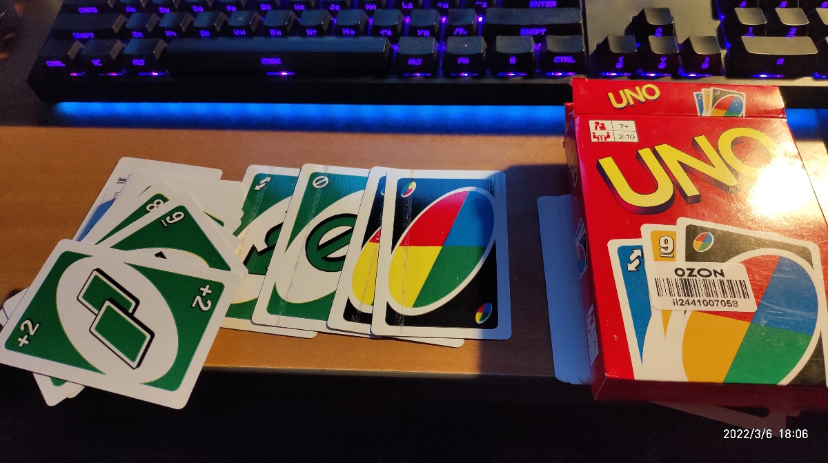Настольная игра "Уно" - классическая игра, в которой нужно использовать карты действий против своих соперников по игре. Цель игры состоит в том, чтобы первым избавиться от всех своих карт в каждом раунде и набрать очки за карты, которые остались на руках