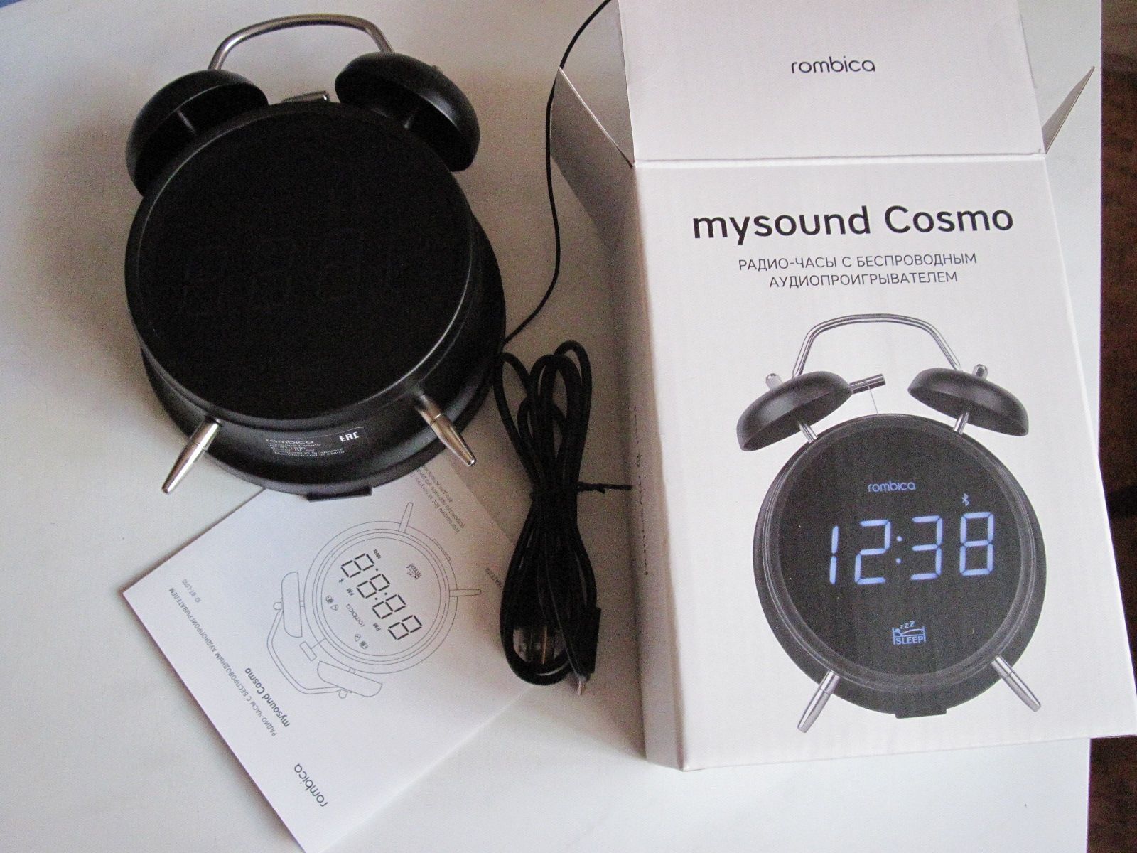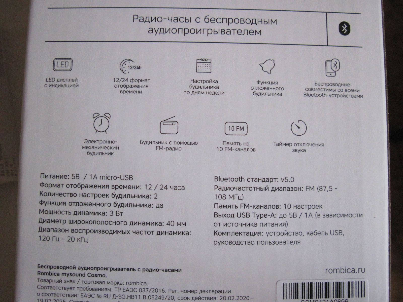 Радио-часы с беспроводной акустикой Rombica mysound Cosmo в алюминиевом корпусе черного матового цвета и питанием через прилагаемый microUSB кабель. Возможно питание от сети через адаптер питания 5V-1A (в комплект не входит).Просыпайтесь с любимой радиост