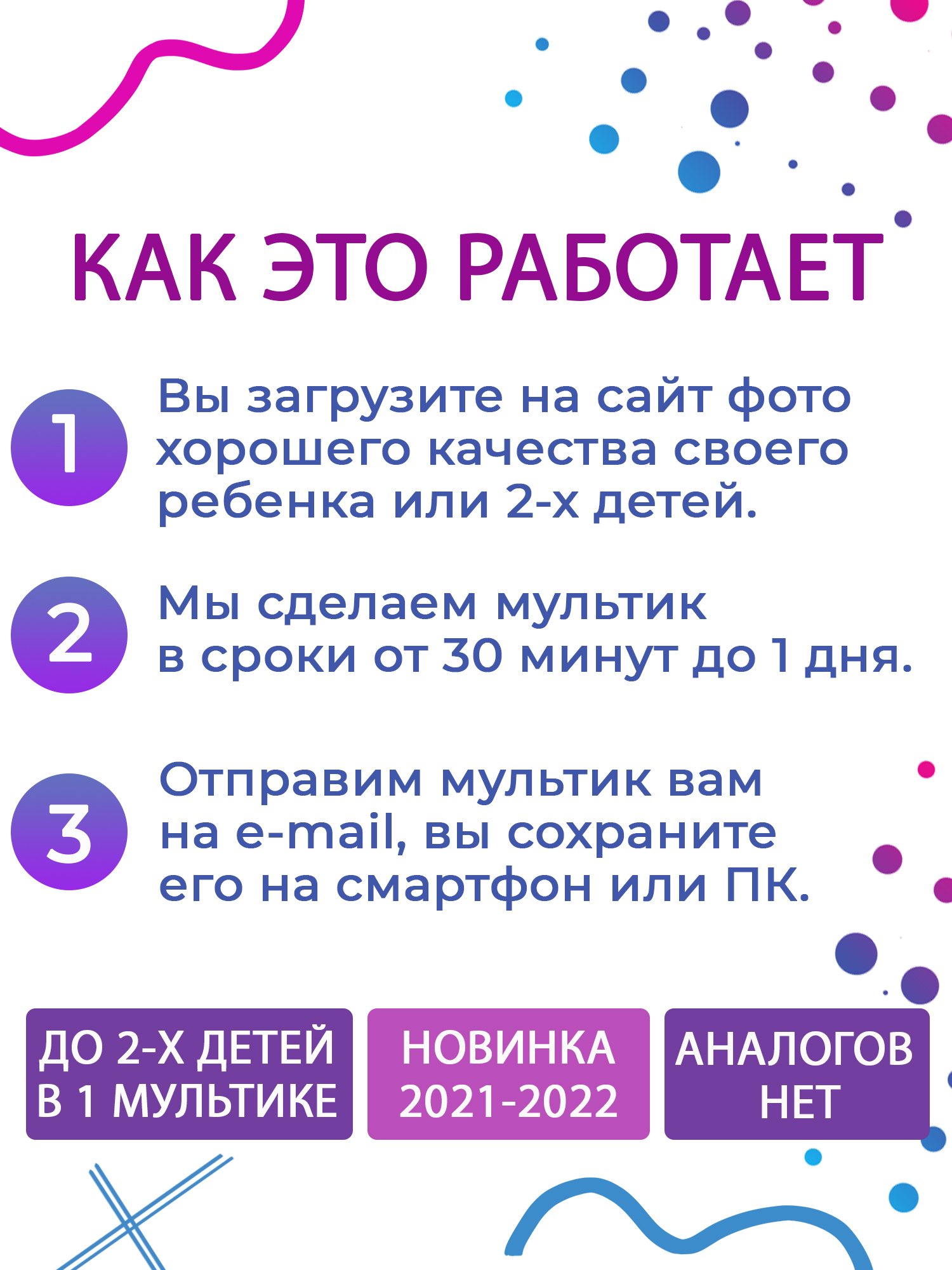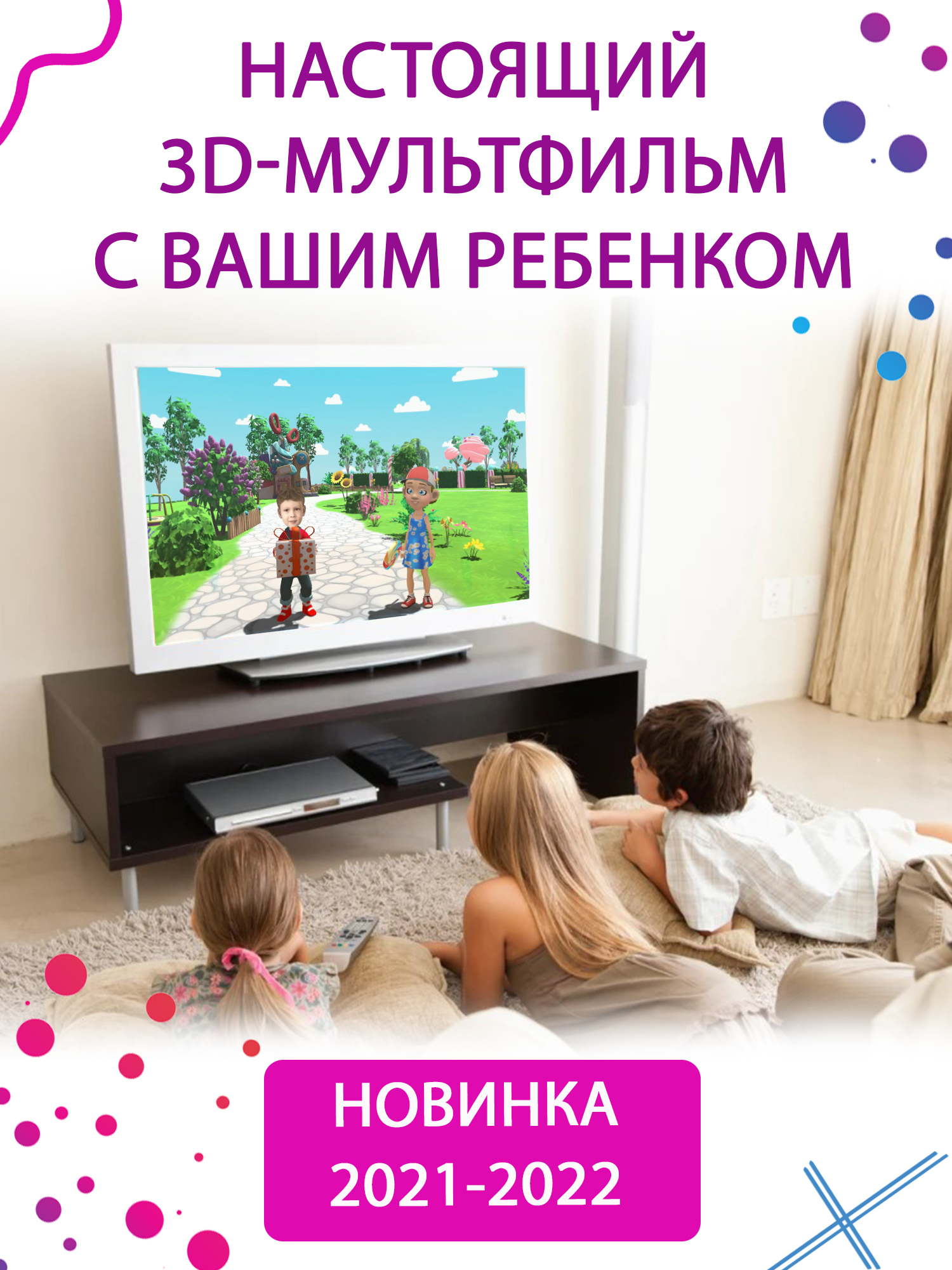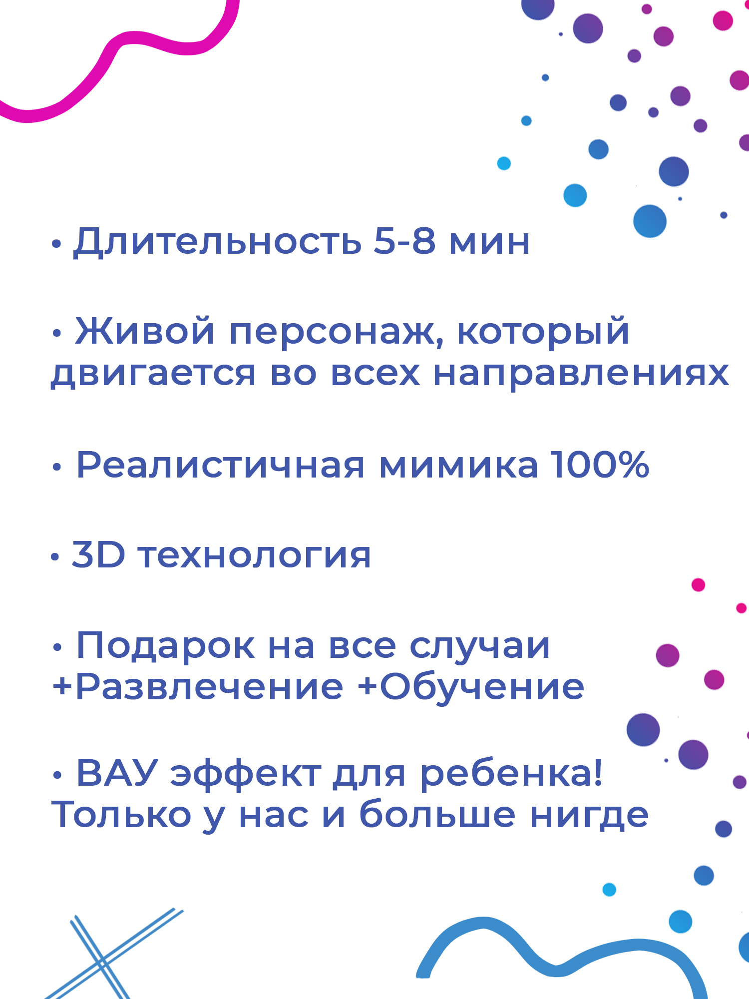 Конкурентные преимущества:-Длительность 5-8 минут.-Живой персонаж, который двигается во всех направлениях.-100% Реалистичная мимика-3D технология-Подарок на все случаи+Развлечение+Обучение-ВАУ эффект для ребенкаЧто входит в услугу:создание 1 мультфильма с