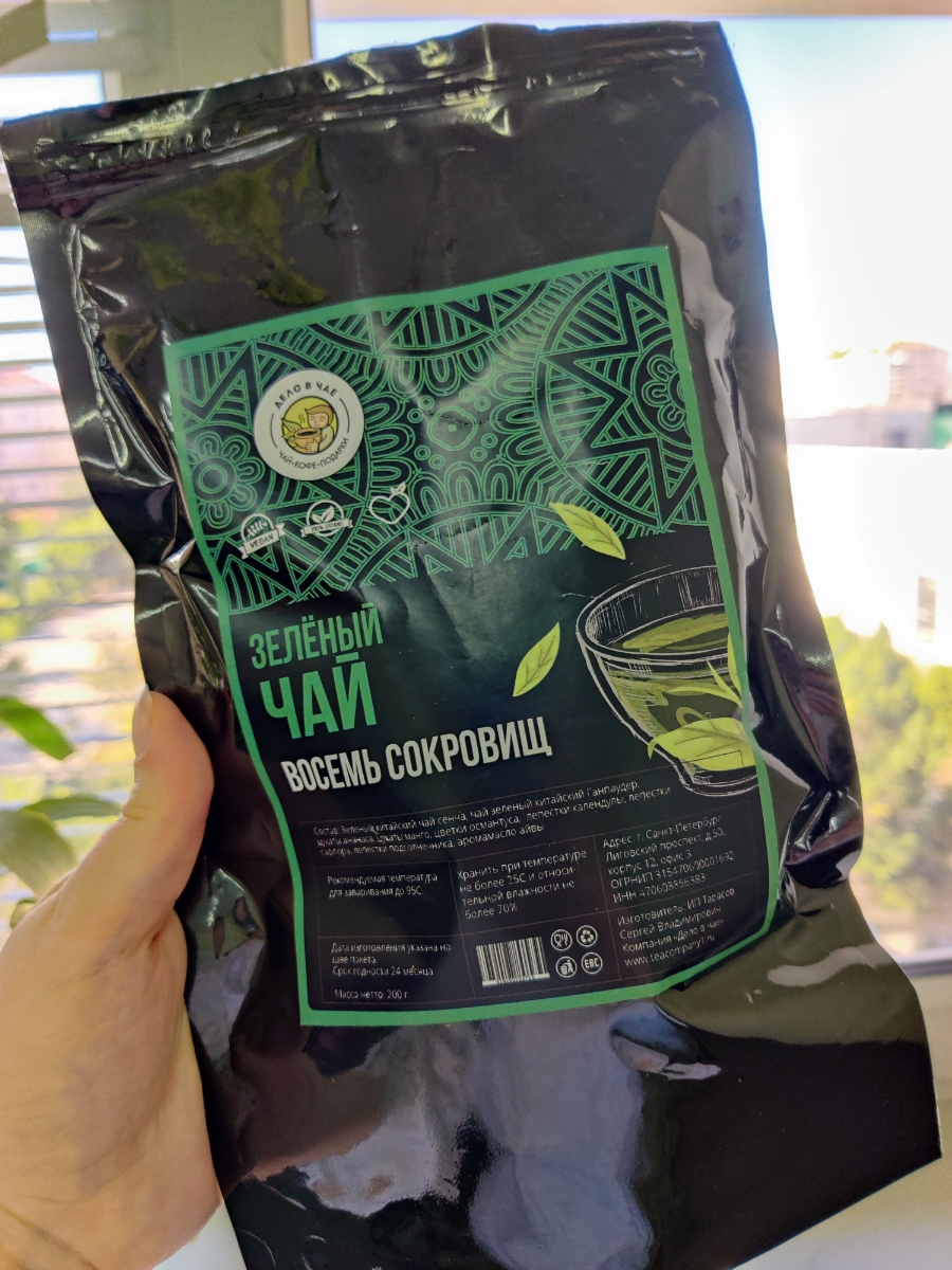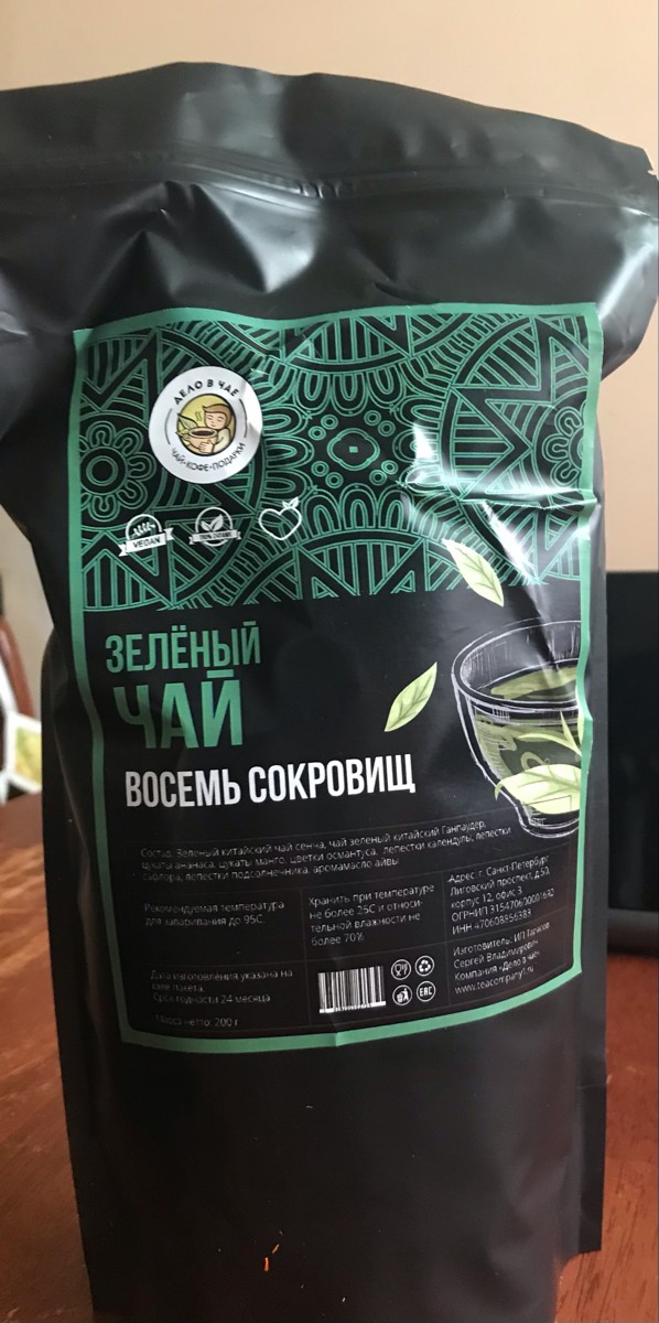 Условия хранения:Хранить при температуре от 5 до 20 градусов и относительной влажности воздуха не более 70%.Состав:Настоящий Китайский Ароматизированный Зеленый чай Восемь сокровищ Шаолиня ( зеленый чай сенча и ганпаудер, ананас, тайский манго, лепестки к