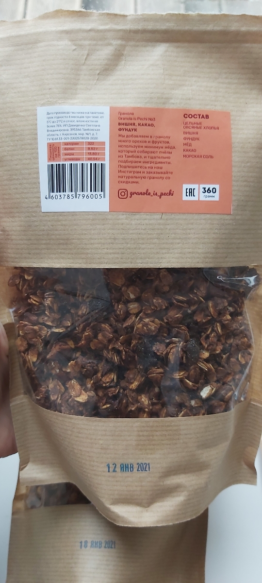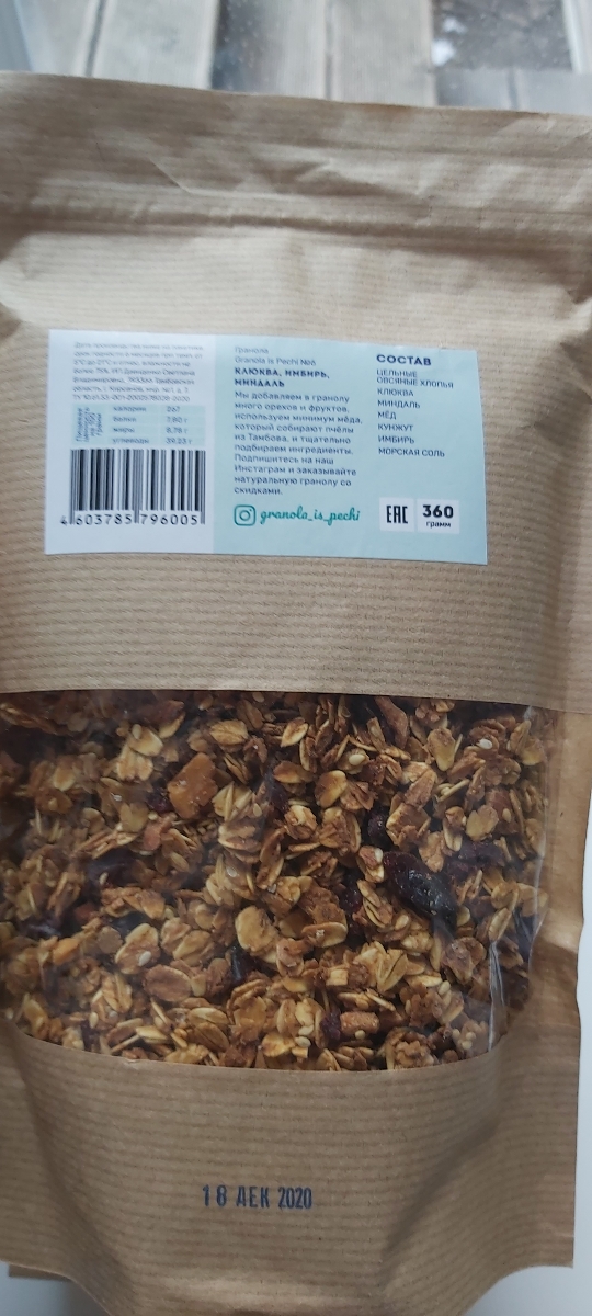 СоставОреховая: Цельные овсяные хлопья, Арахис, Фундук, Мёд, Грецкий орех, Семена тыквы, Семена льна, Морская соль. Банан, Миндаль, Клубника, Чиа: Цельные овсяные хлопья, Миндаль, Банан, Мёд, Клубника, Кокосовая стружка, Семена чиа, Ваниль, Морская соль. Виш