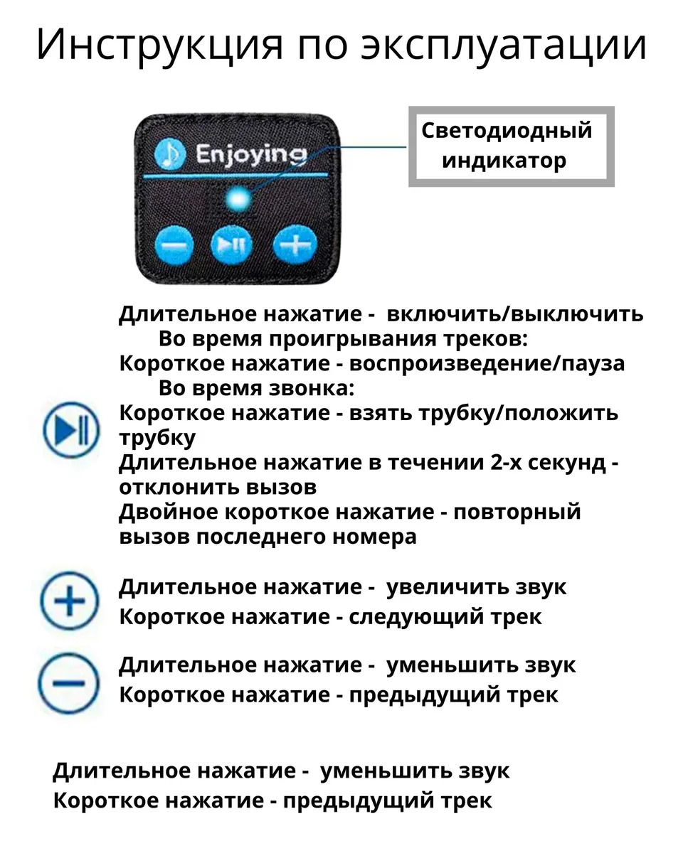 УправлениеОстановка/воспроизведение музыки, Предыдущий трек, Взять/положить трубку, Регулировка громкости, Следующий трек, Включение/отключение микрофона