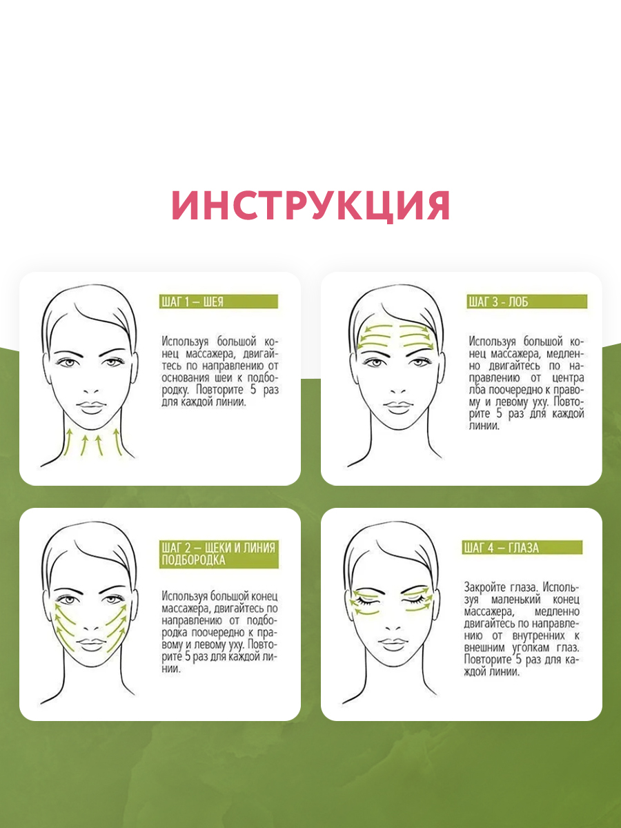 Способ примененияСпособ применения: Подготовьте кожу к массажу. Очистите лицо от макияжа. С помощью нефритового массажера для лица начните массаж от подбородка, плавно проводя снизу вверх, по контуру лица, к ушам. Массажер для лица используйте для массажа области вокруг г