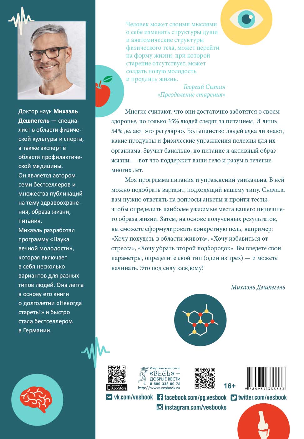 Оставайтесь 40-летними в течение 20 лет и больше - с помощью последних достижений спортивной и пищевой медицины. Немецкий доктор наук Михаэль Дешпегель разработал эффективную трехмесячную программу, которая помогает улучшить образ жизни, надолго сохранить
