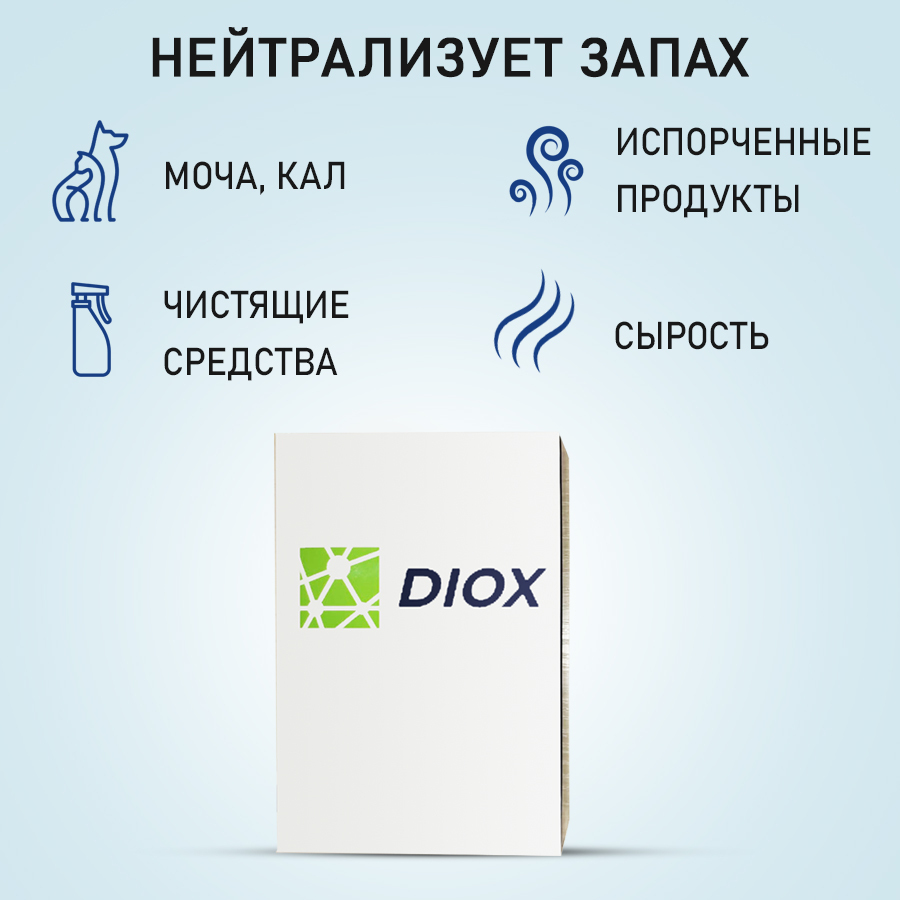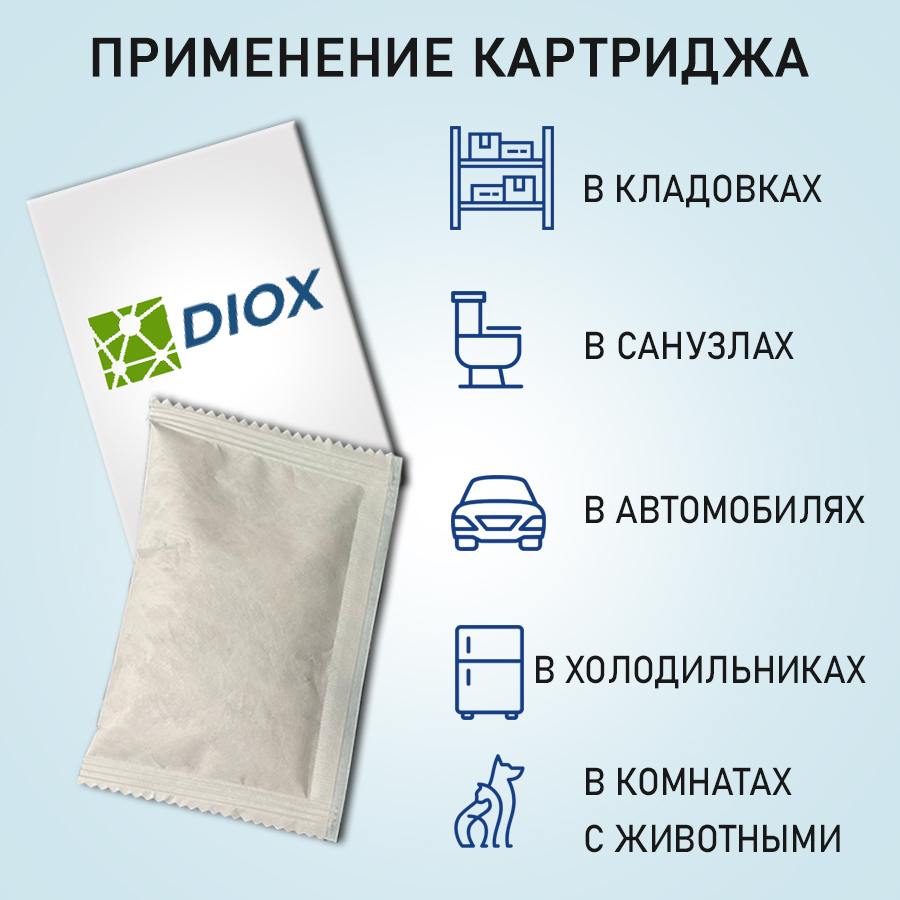 Комплектация:В упаковке 4 пакетика по 10 гр.Описание:DIOX служит для удаления неприятных запахов, дезинфекции и предотвращения развития грибков, бактерий и вирусов на небольших площадях до 5 кв. м. Идеально подходит для таких пространств, как кладовые, ту