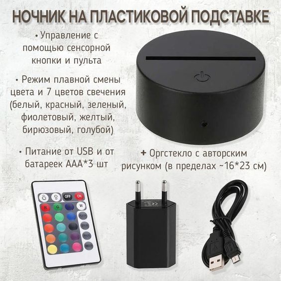 Комплектация:• Подставка из пластика с сенсорной кнопкой. • Дистанционный пульт управления. • Оргстекло с авторским рисунком (в пределах 16*23 см). • USB кабель 1 м. • Блок питания. • Инструкция по эксплуатации. • Крафтовая упаковка и наполнитель.Описание