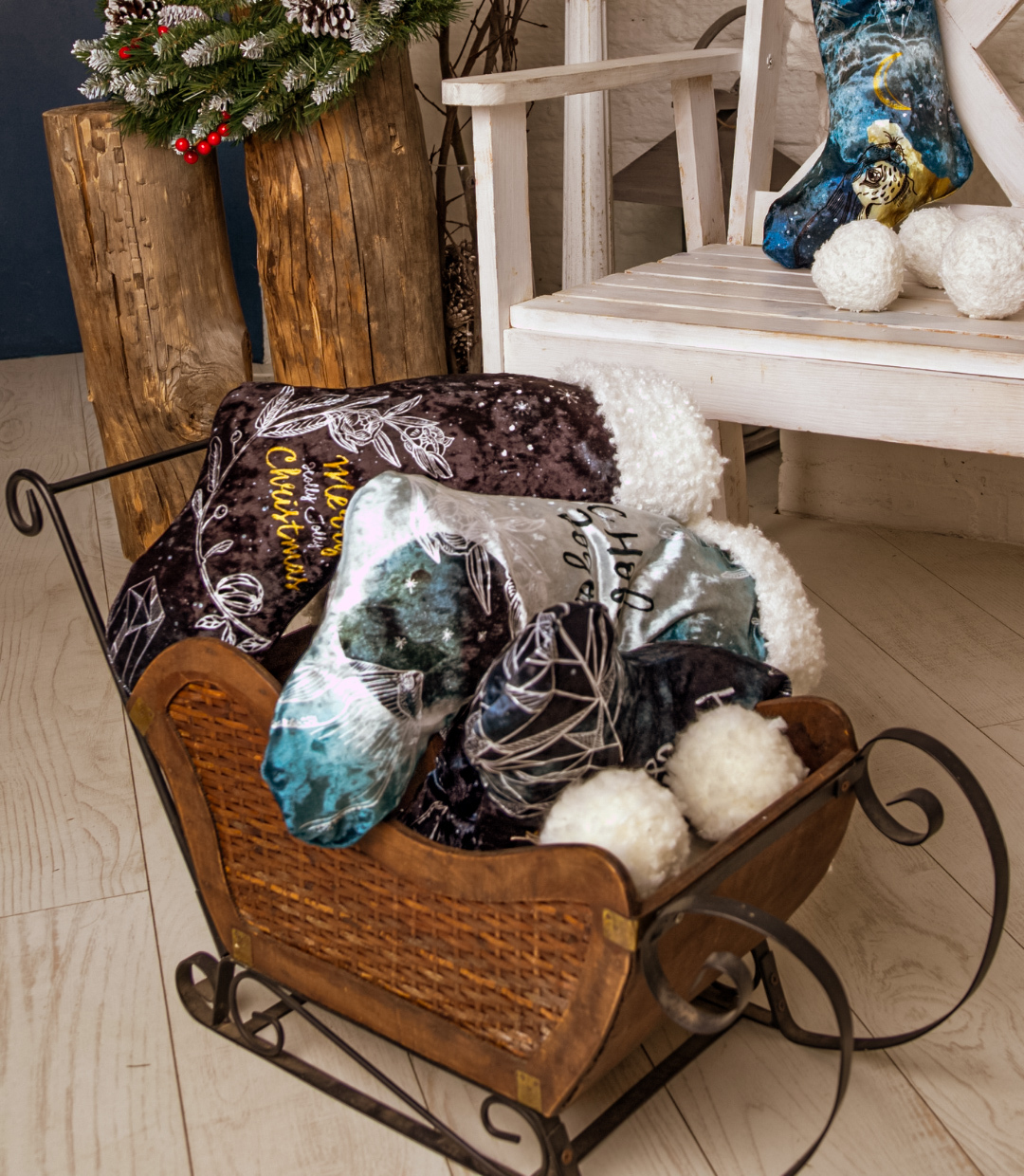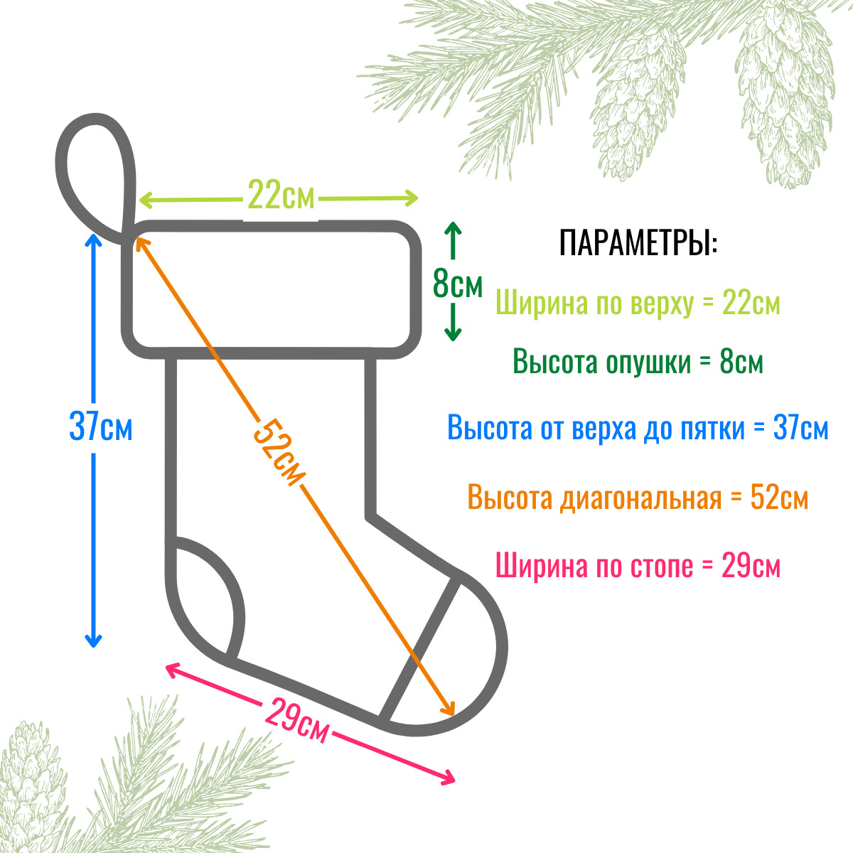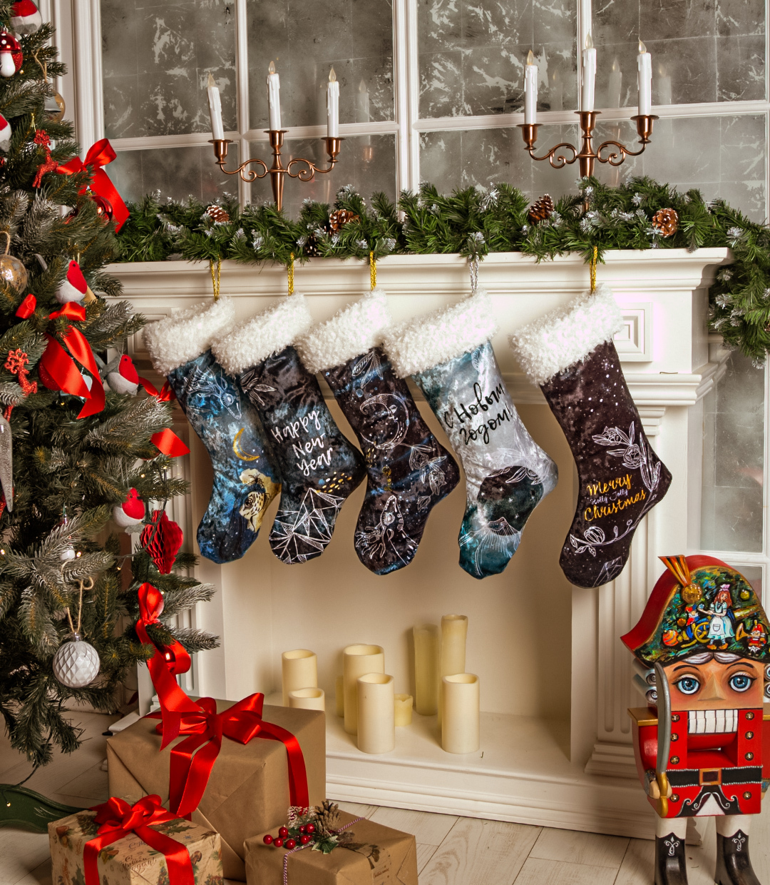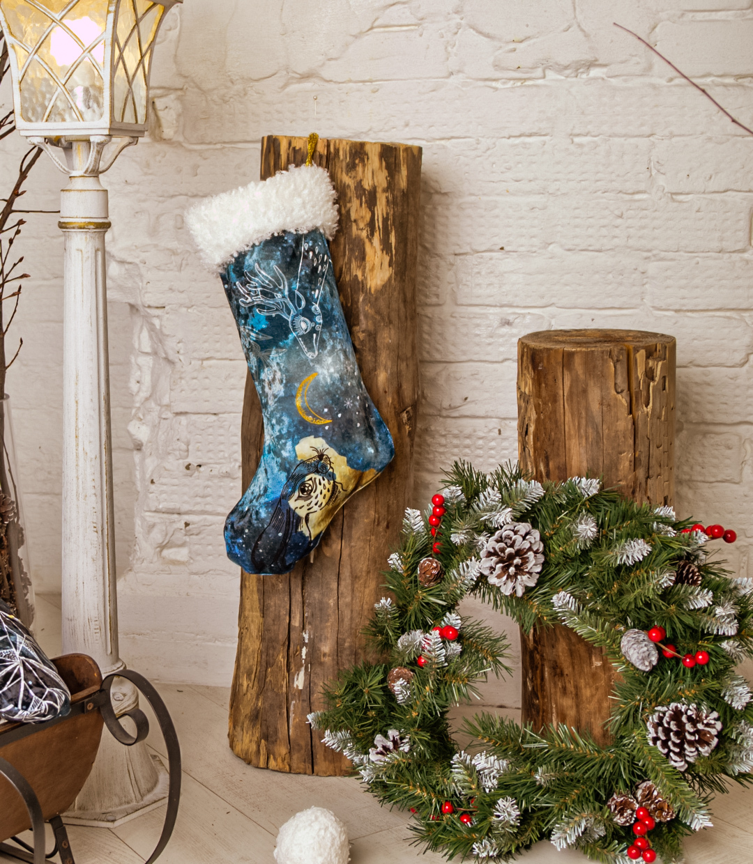 Комплектация:Рождественский носок - 1 шт.Рисунок с 2-х сторон + опушка из искусственного меха + петелька из тесьмы.Описание:Роскошная бархатная коллекция рождественских носков под названием Рождественская ночь включает в себя 5 вариантов в синем цвете и 5
