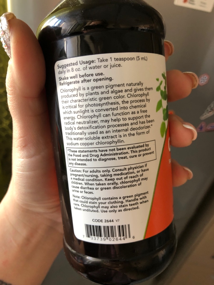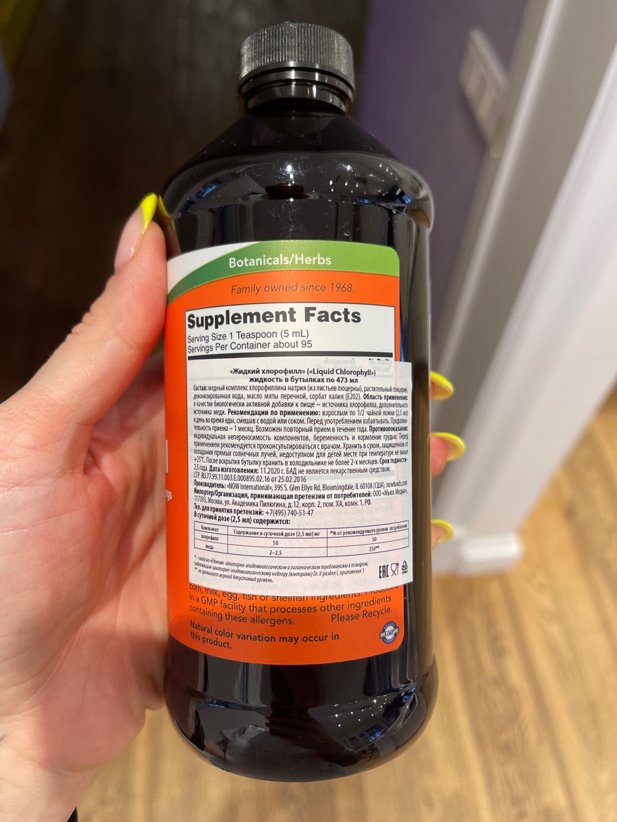 Состав: медный комплекс хлорофиллина натрия (из листьев люцерны), растительный глицерин, деионизированная вода, масло мяты перечной, сорбат калия (Е202)Способ применения:взрослым по 1/2 чайной ложки (2,5 мл) в день во время еды, смешав с водой или соком.