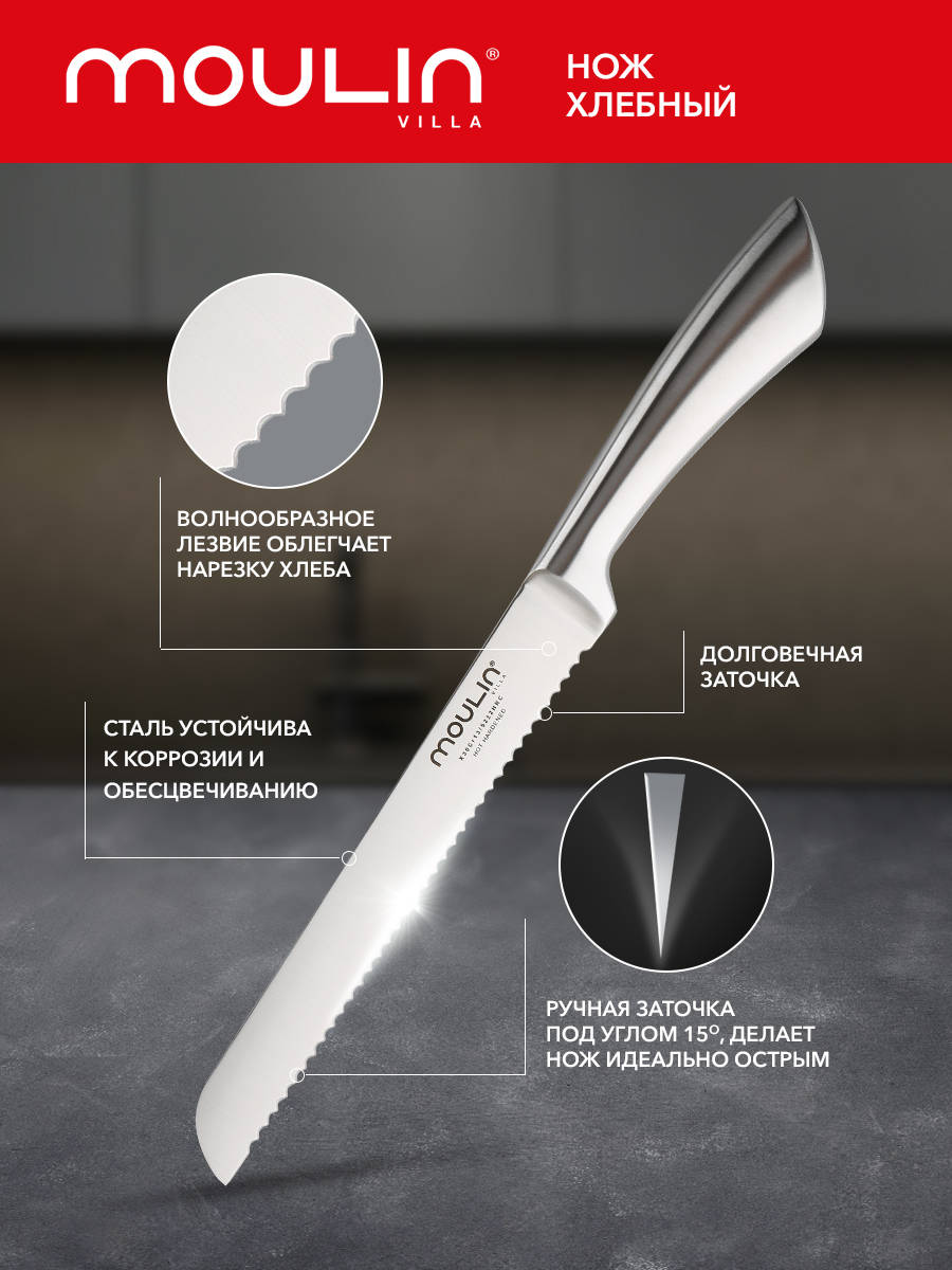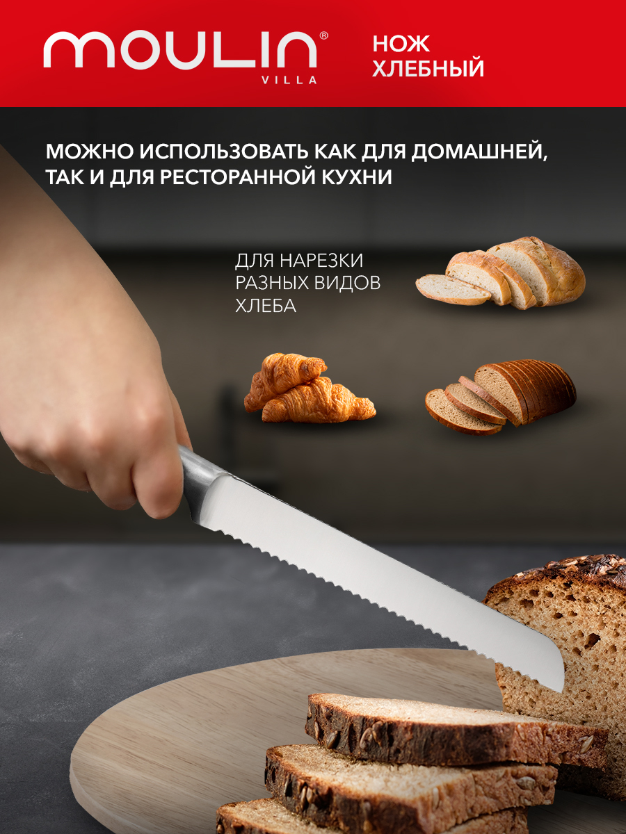 Комплектация:Нож для нарезки хлеба - 1 шт.Описание:Нож Moulin Villa Lion MLNB-20 с волнообразным лезвием предназначен специально для аккуратной и быстрой нарезки хлеба, батона и булочек. Хлебный нож выполнен из безопасной высококачественной стали марки 3C