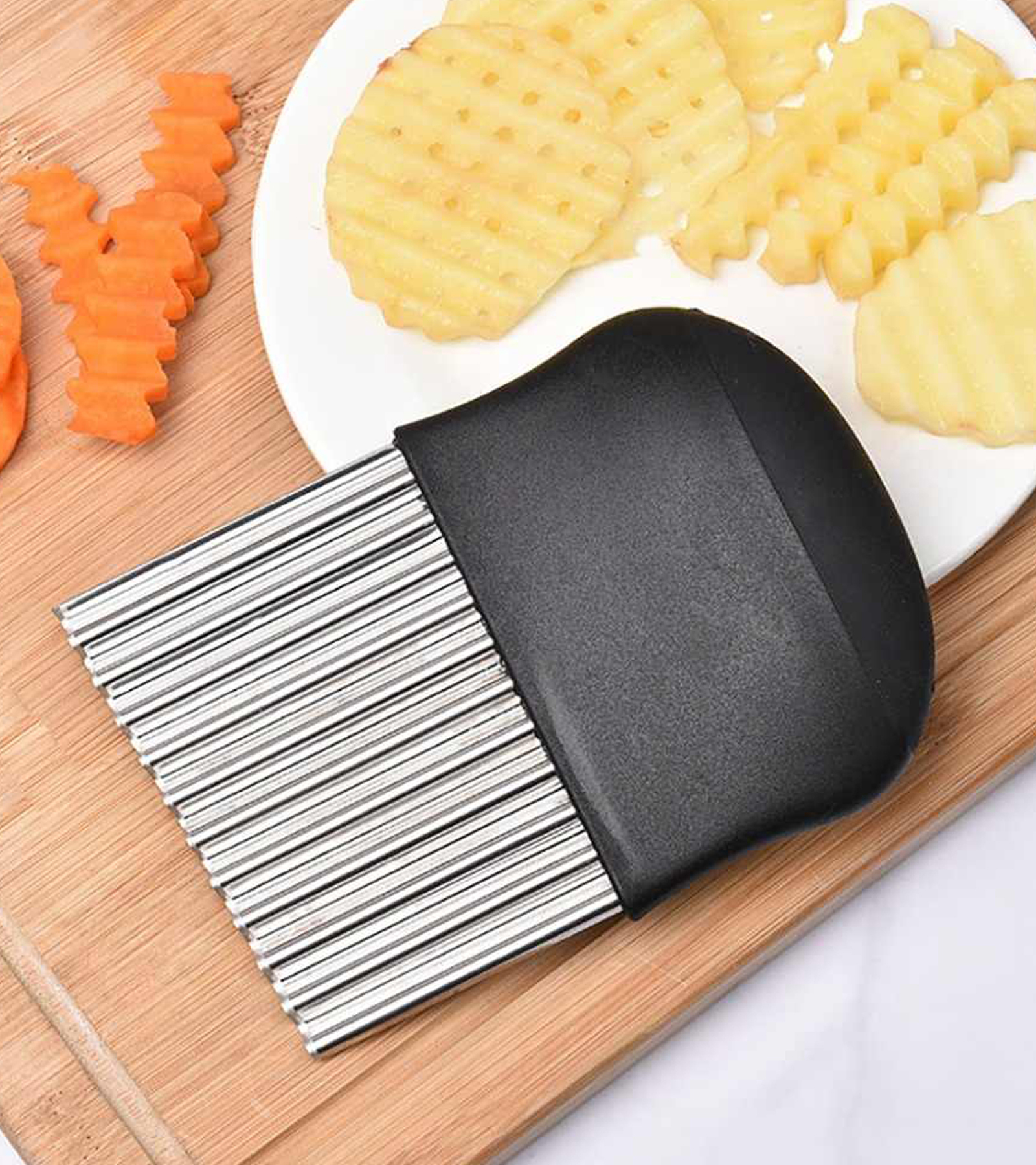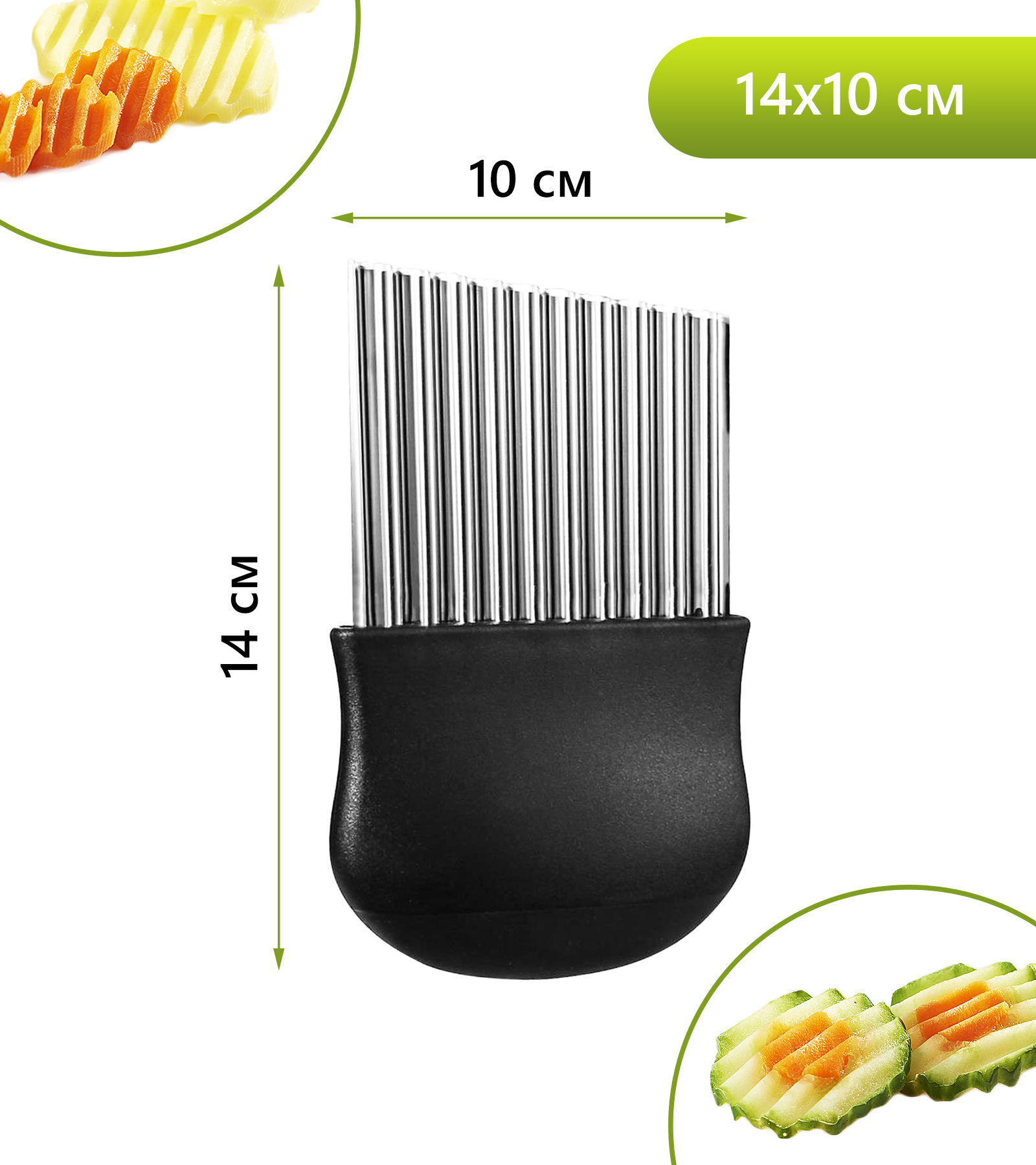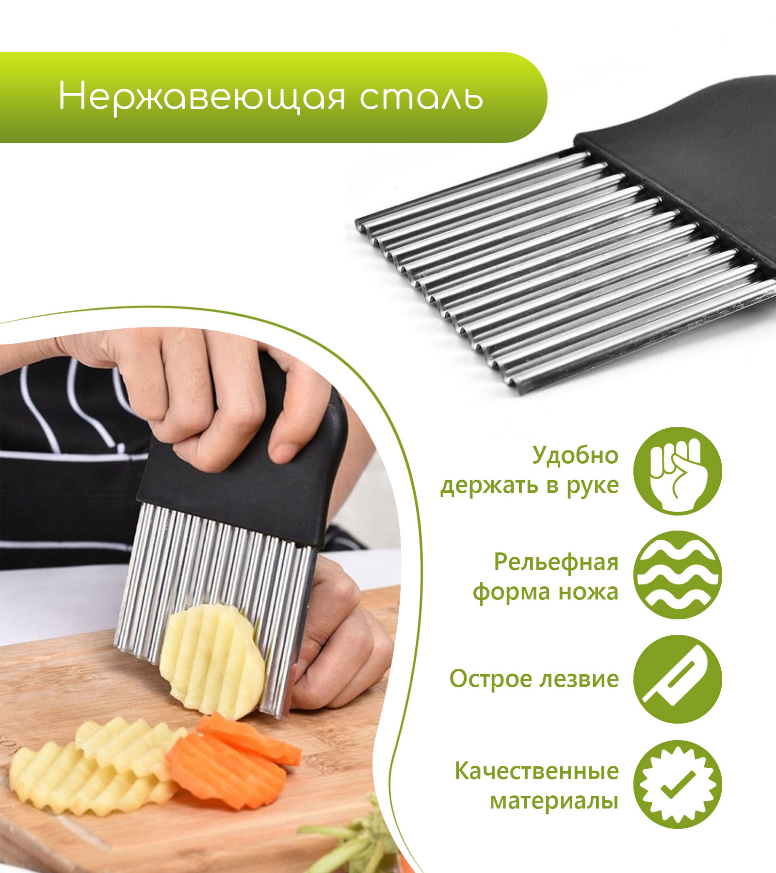 Нож для волнистой нарезки предназначен для фигурной нарезки фруктов, овощей и любых других продуктов. При нарезании продуктов он придает поверхности ломтиков красивую волнистую форму. Нож позволяет сделать украшения из сыра, огурца, редиса, моркови, яблок