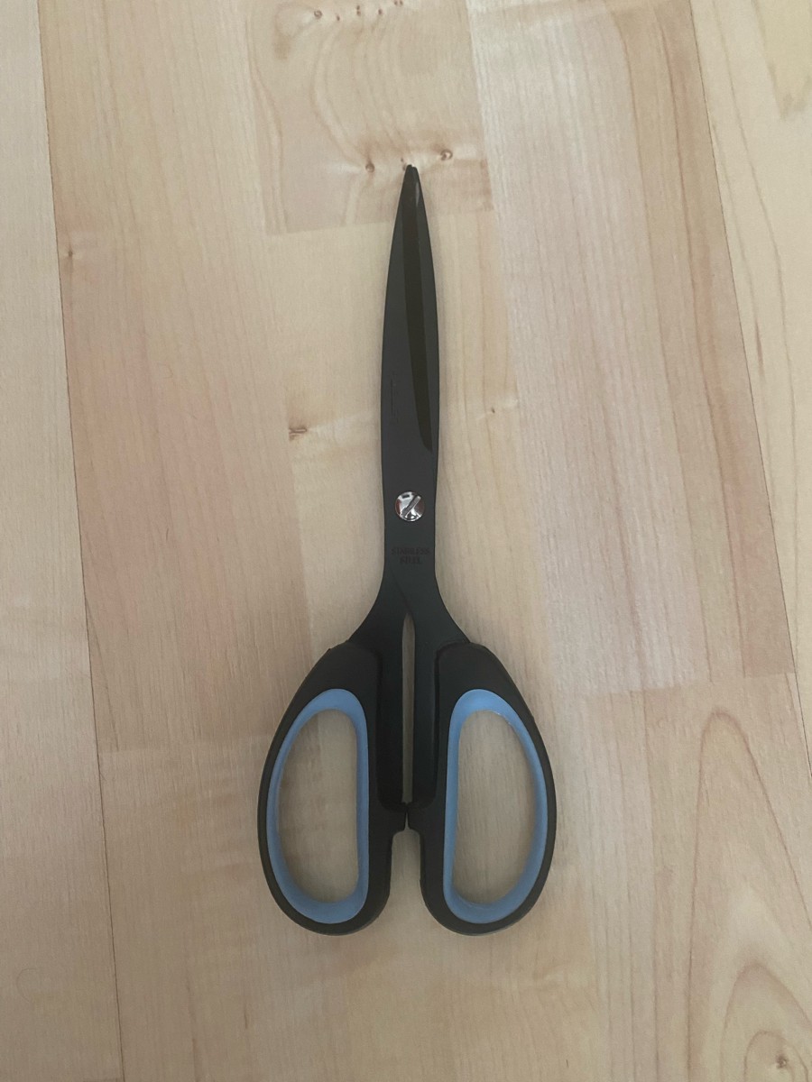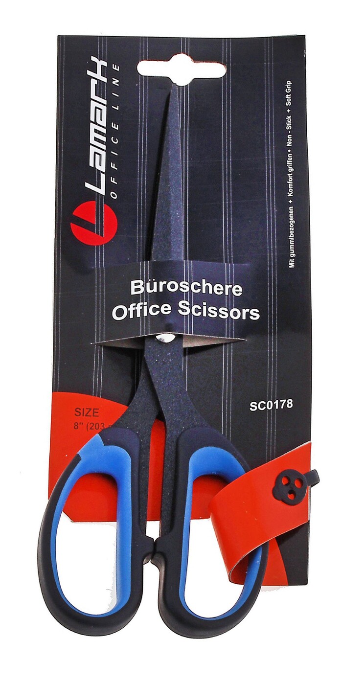 Ножницы канцелярские Lamark из нержавеющей стали с черным покрытием лезвий Non Stick. Эргономичные пластиковые ручки с удобным захватом с синими резиновыми вставками обеспечивают комфортную работу с материалами разной плотности. Размер ножниц 20,3 см. Пос