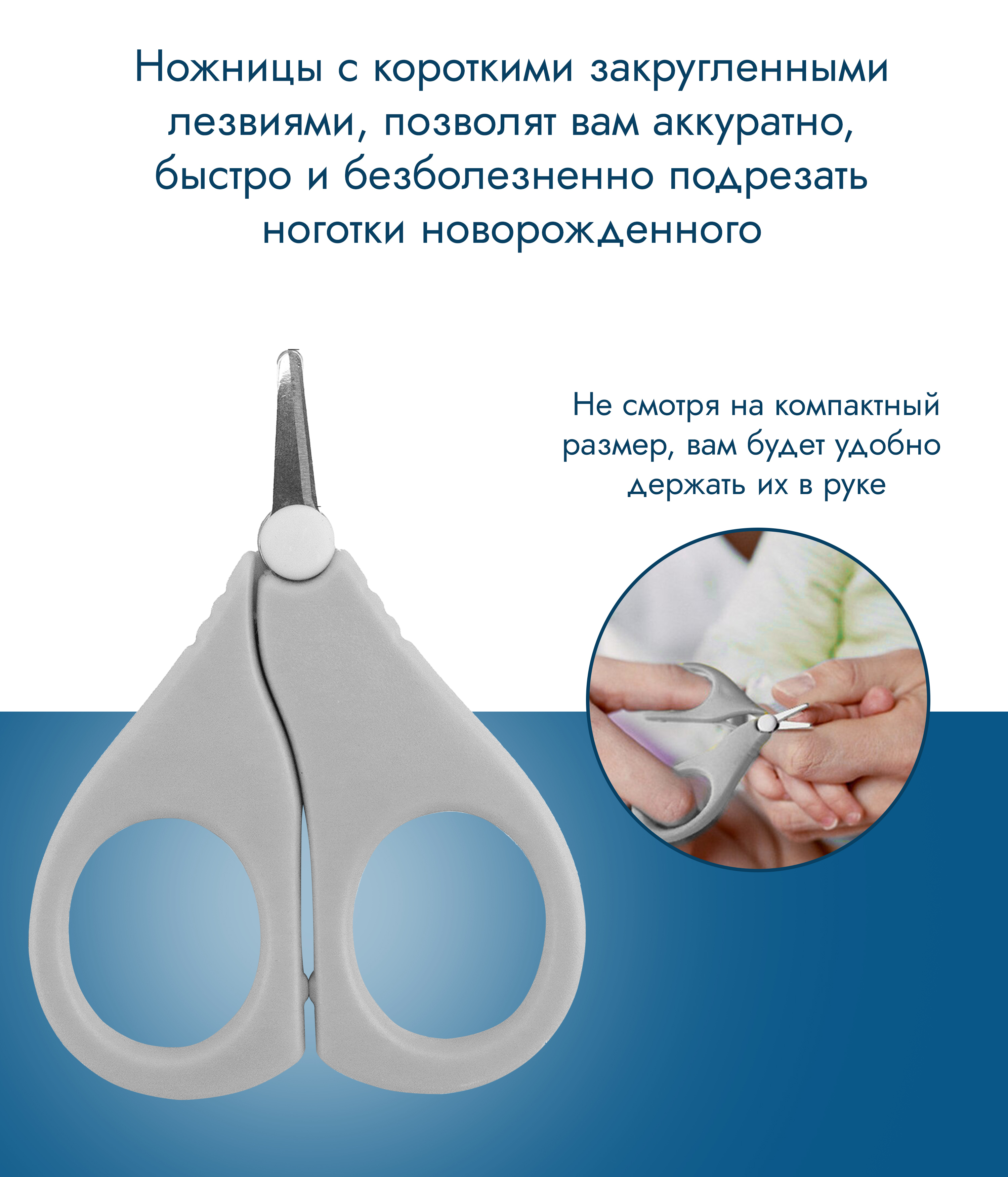 Ножницы для ногтей новорожденных позволяют подстригать ногти малыша сразу после рождения. Удобная устойчивая ручка, изготовленная из антибактериального материала, надежно фиксируется тремя пальцами.