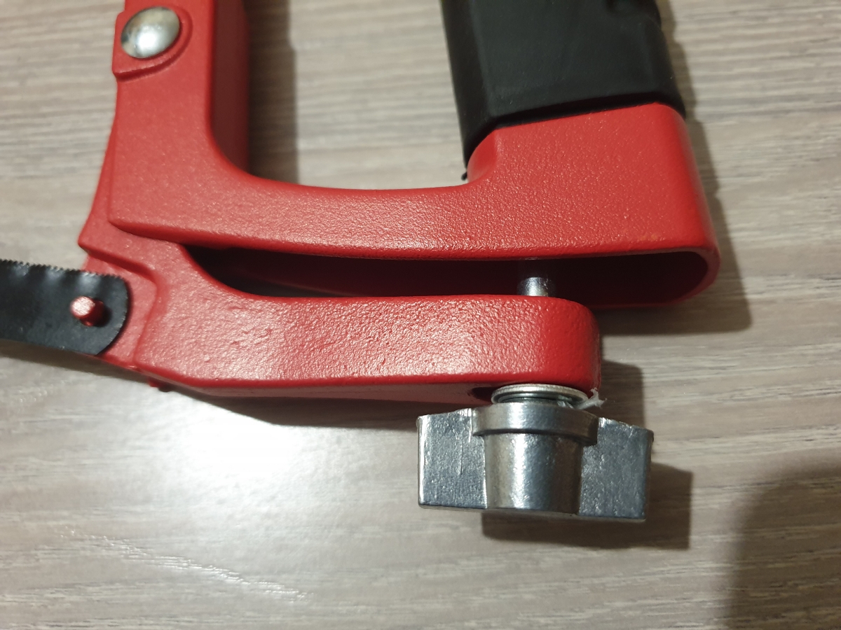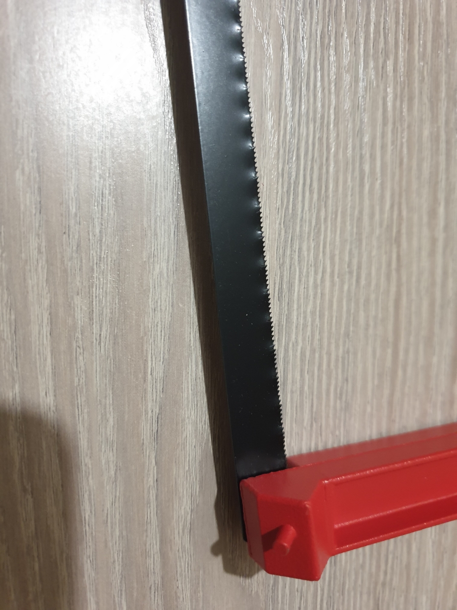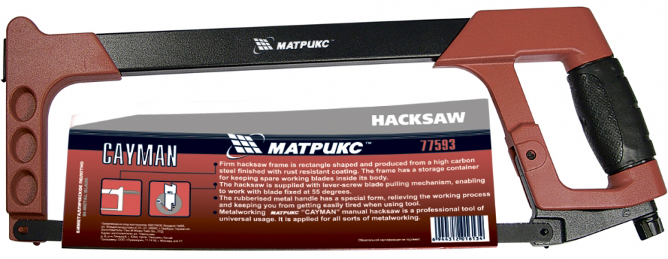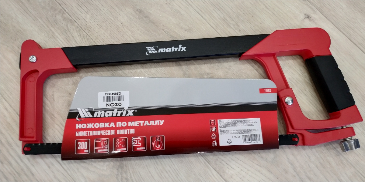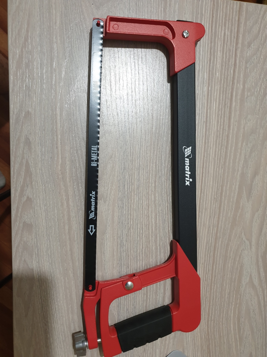 Ножовка имеет обрезиненную рукоятку эргономичной формы. Рычажно-винтовой механизм натяжения полотна позволяет быстро произвести замену полотна, В корпусе рамки ножовки расположено место для хранения 5 полотен. Конструкция рамки ножовки позволяет устанавли